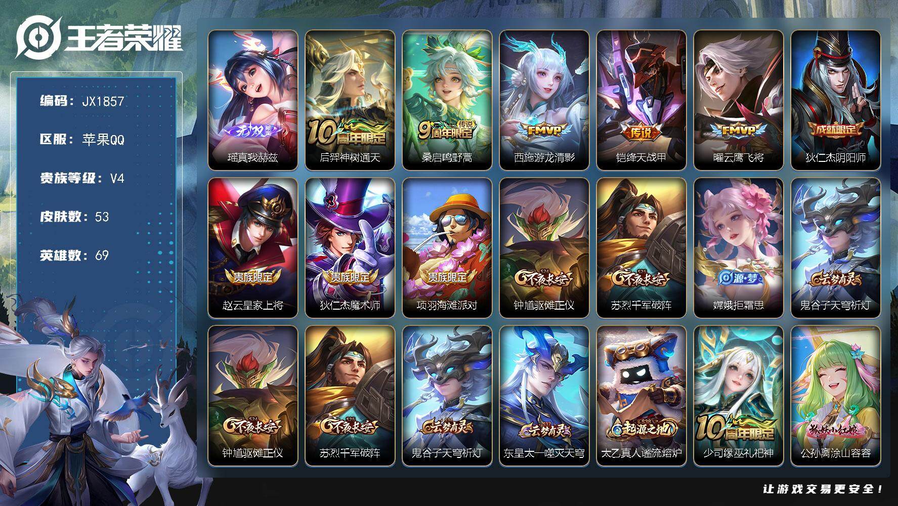【JX1857】贵族4/皮肤53/传说5/史诗11/英雄69/影全皮/瑶-真我
