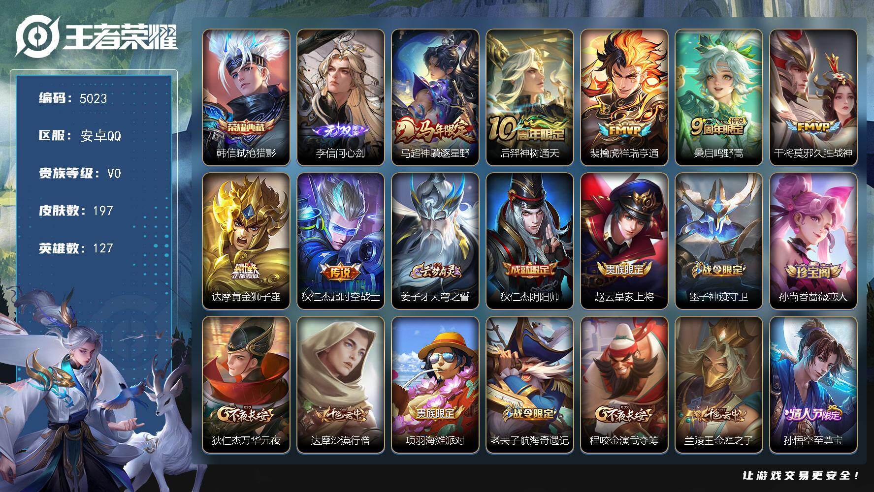 安卓Q-V0-最强王者段位-127英雄-197皮肤-1典藏皮肤-1无双-7传说