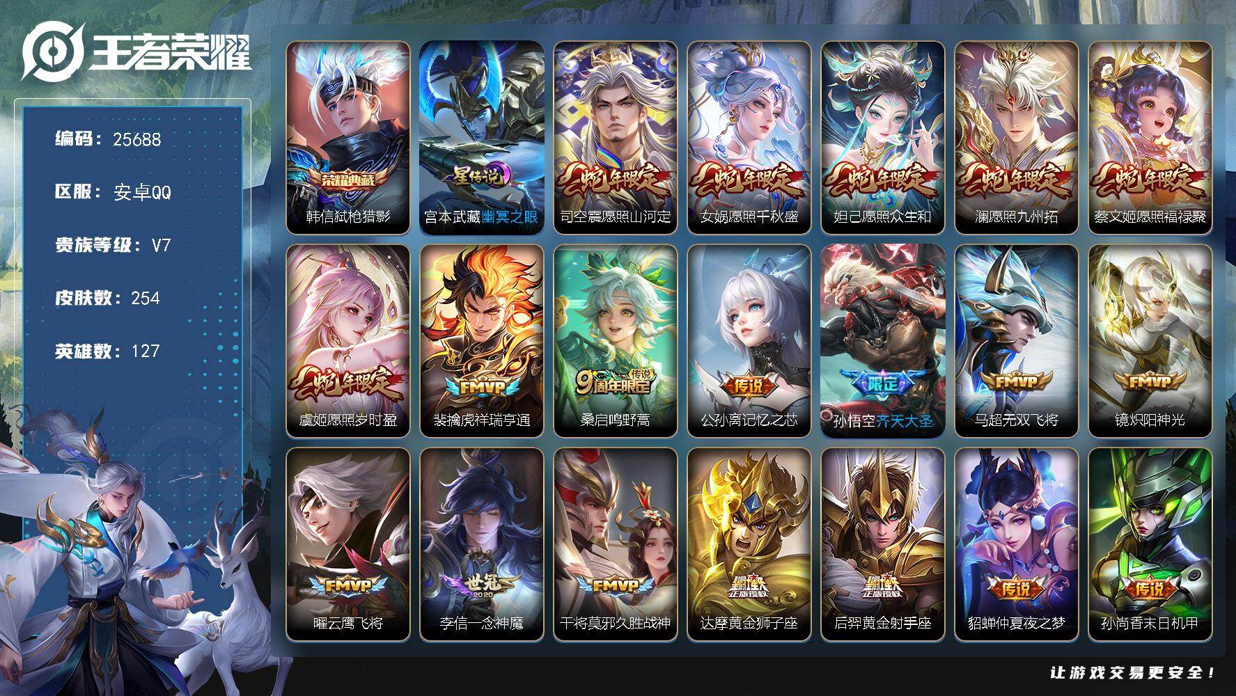 安卓Q-V6-永恒钻石I段位-126英雄-143皮肤-1典藏皮肤-4传说-30
