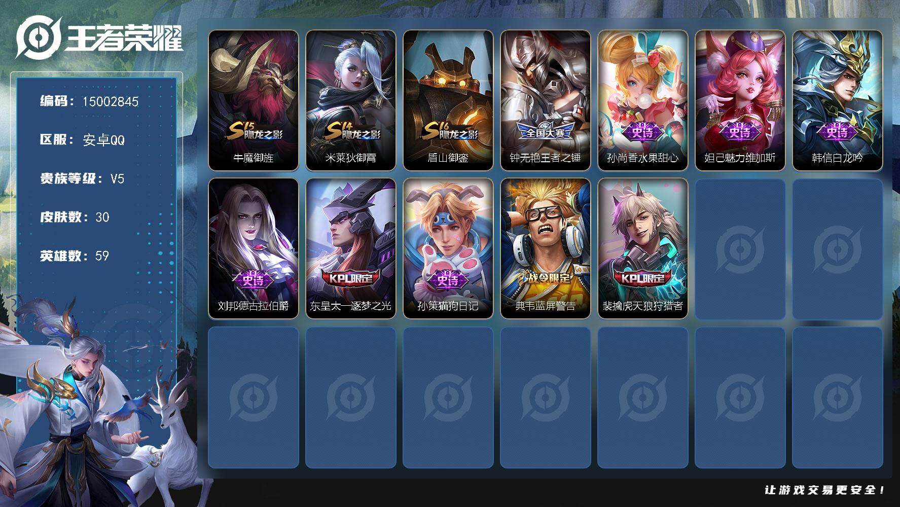 安卓QQ-10传说-138皮肤-121英雄-无双王者-极品战士打野小号。看上的来。