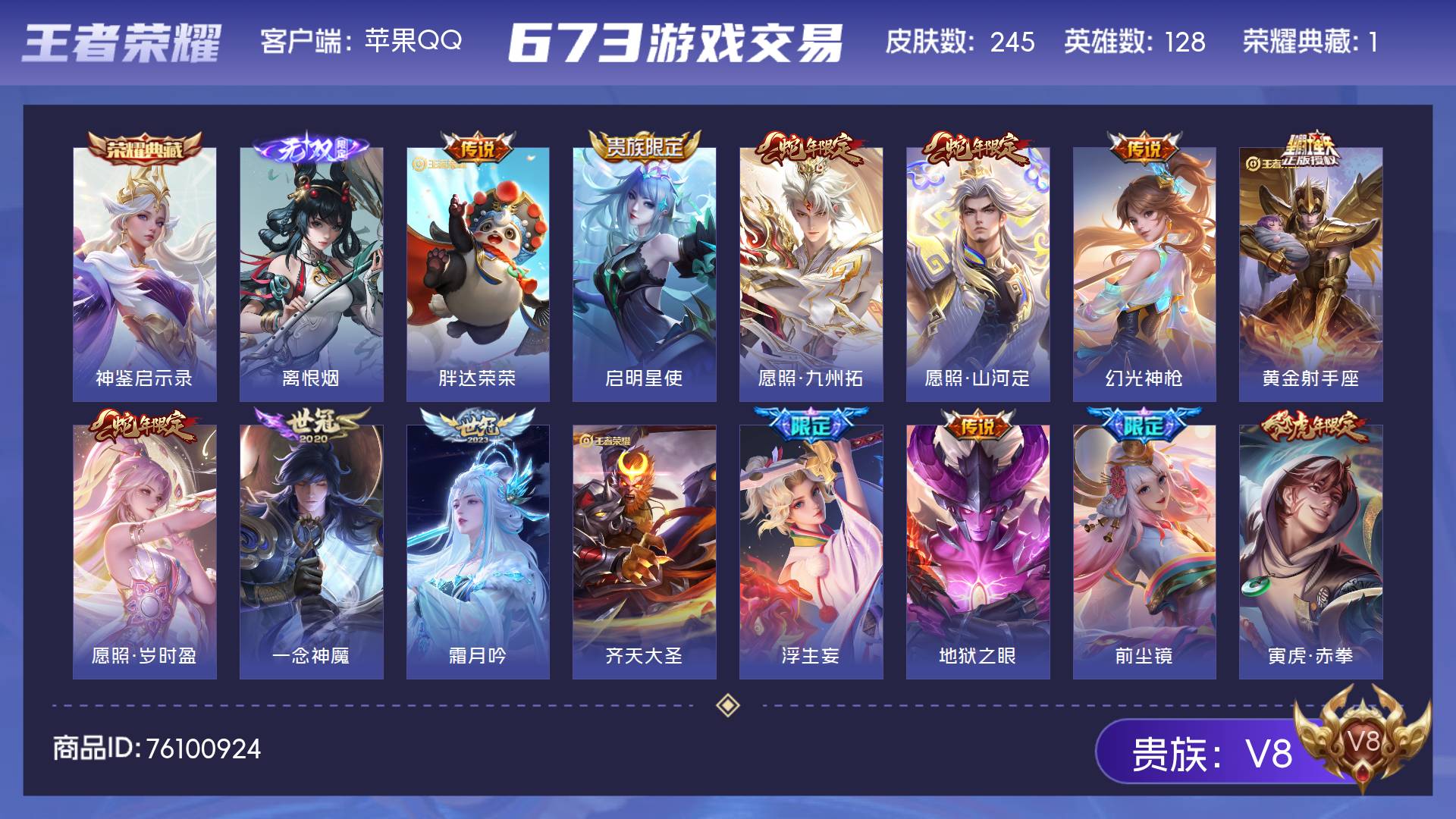 V8 皮肤245 英雄128 至尊星耀 荣耀典藏1 无双皮肤1 星传说3 传说15 其他皮肤235