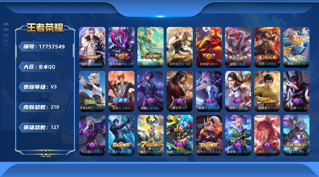 V3-最强王者段位-127英雄-210皮肤-1典藏皮肤-4传说-54史诗