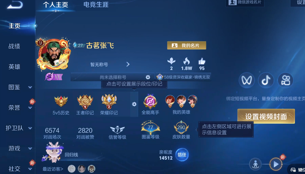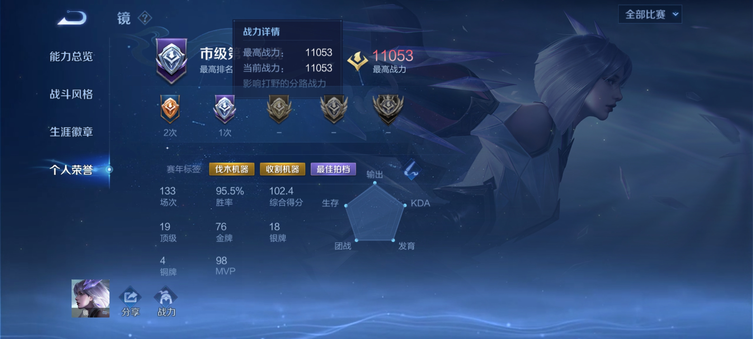 贵族等级: V7 英雄数: 127 皮肤数: 284 荣耀水晶: 全息碎影 星