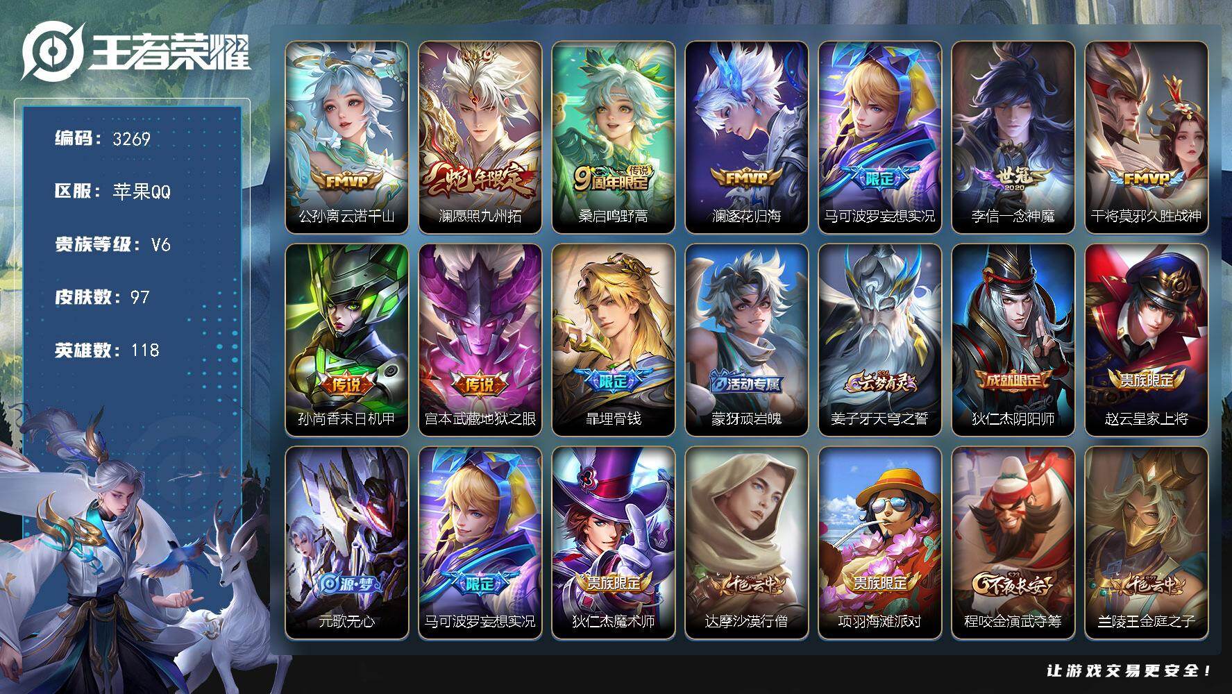 【自玩精品小号,9质量传说,2星传说,6按键,7700战力司马懿】苹果Q-V