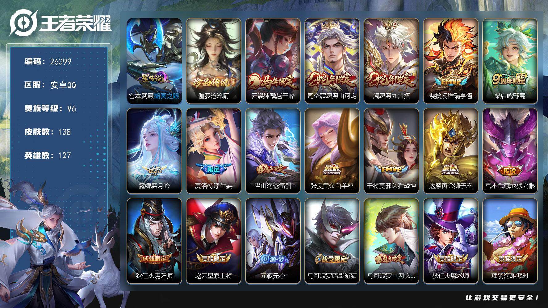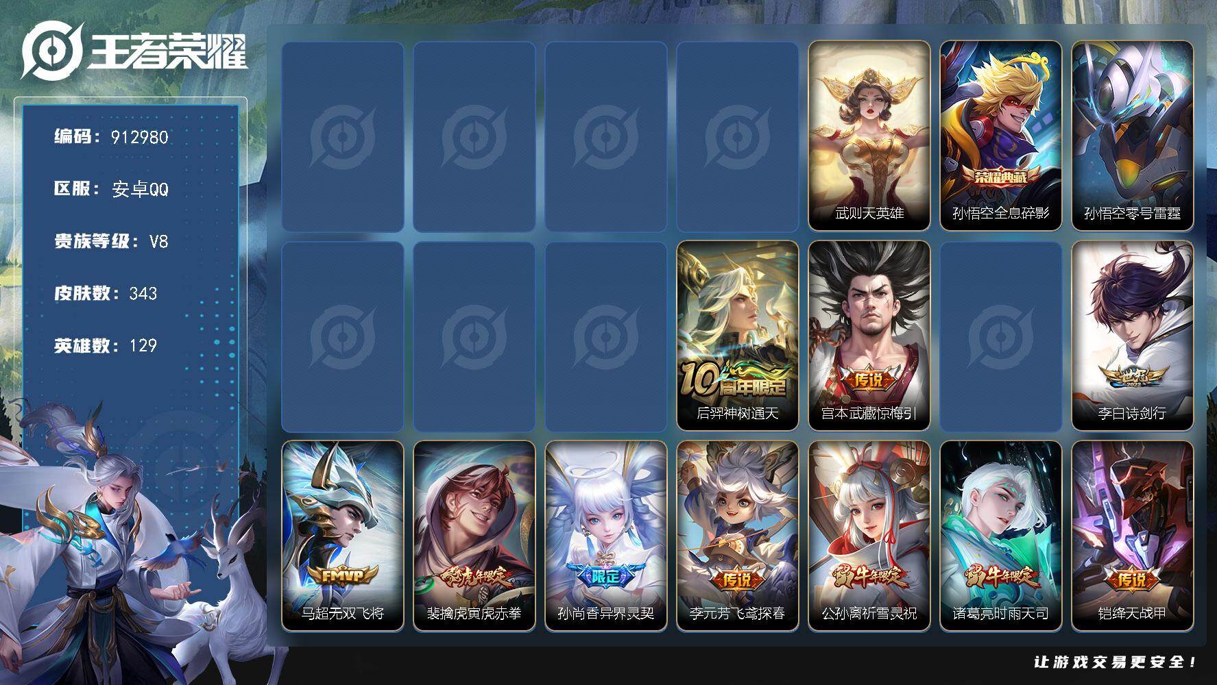 V8-最强王者段位-129英雄-343皮肤-1典藏皮肤-1典藏英雄-26传说-95史诗