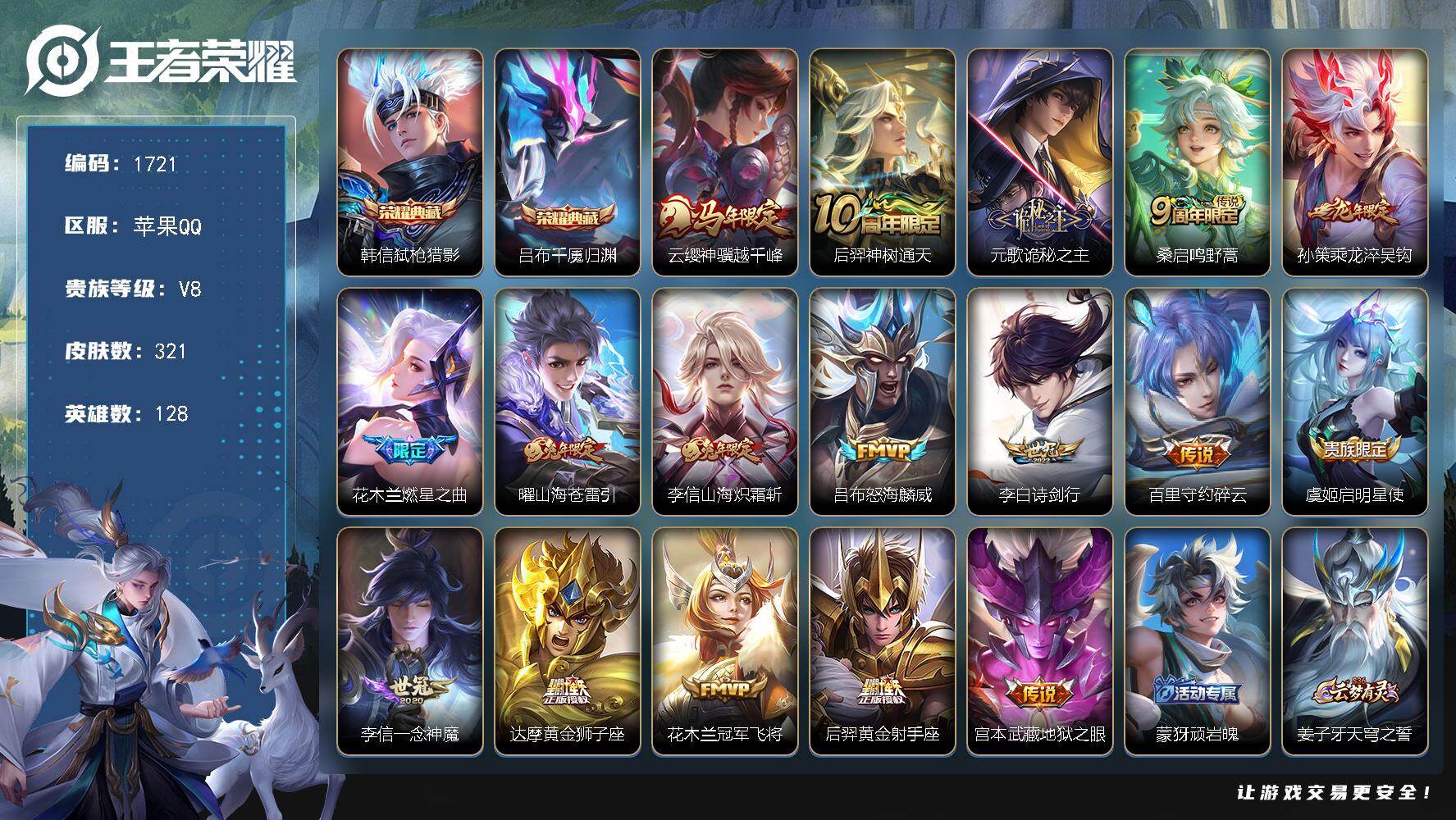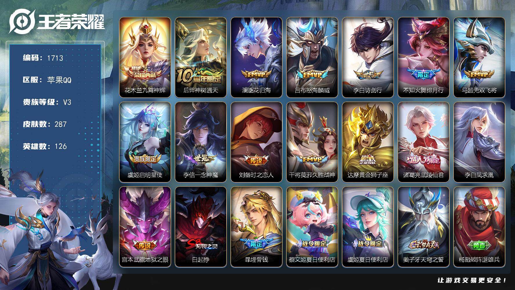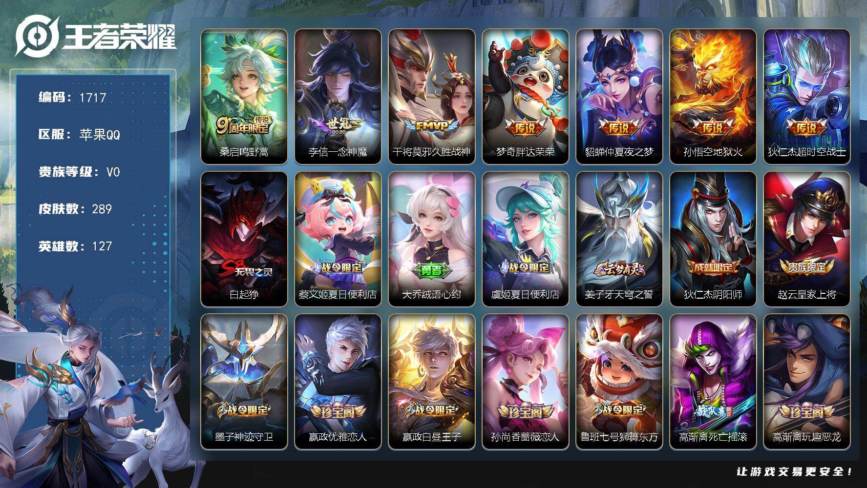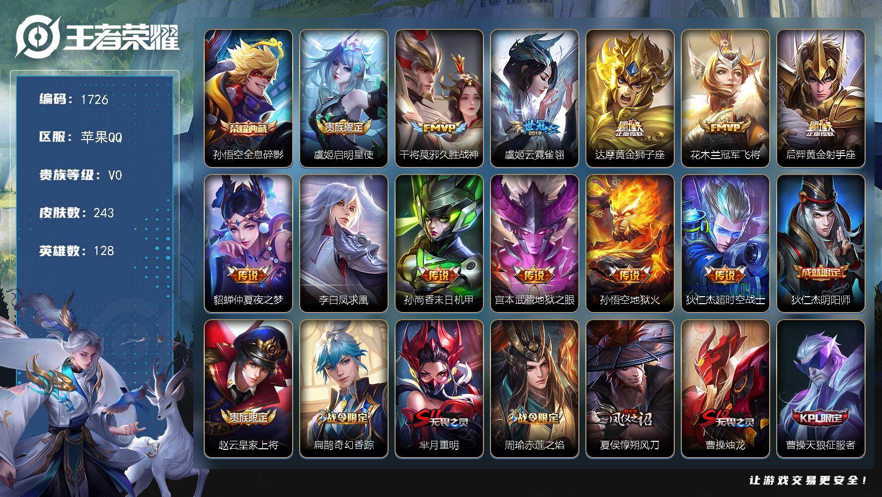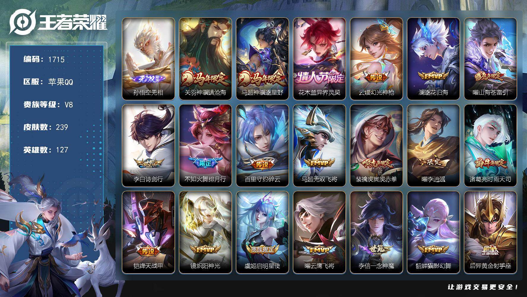 苹果Q-V8-最强王者段位-127英雄-239皮肤-1无双-22传说-66史诗