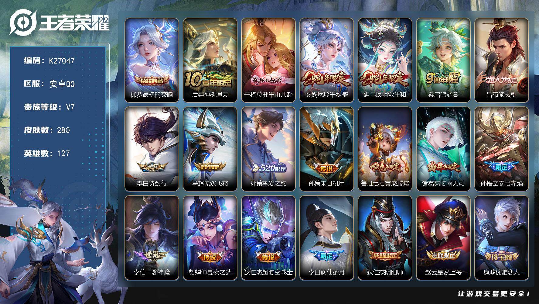 安卓Q-V7-最强王者段位-127英雄-280皮肤-1典藏皮肤-16传说-92史