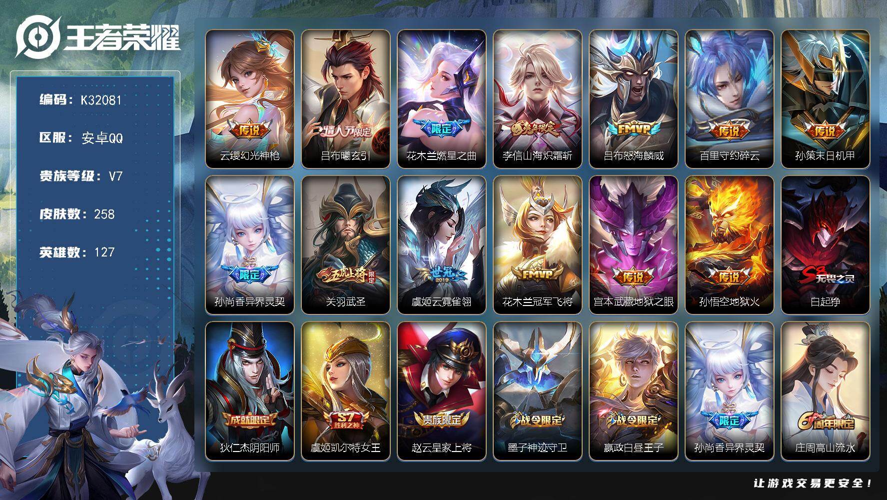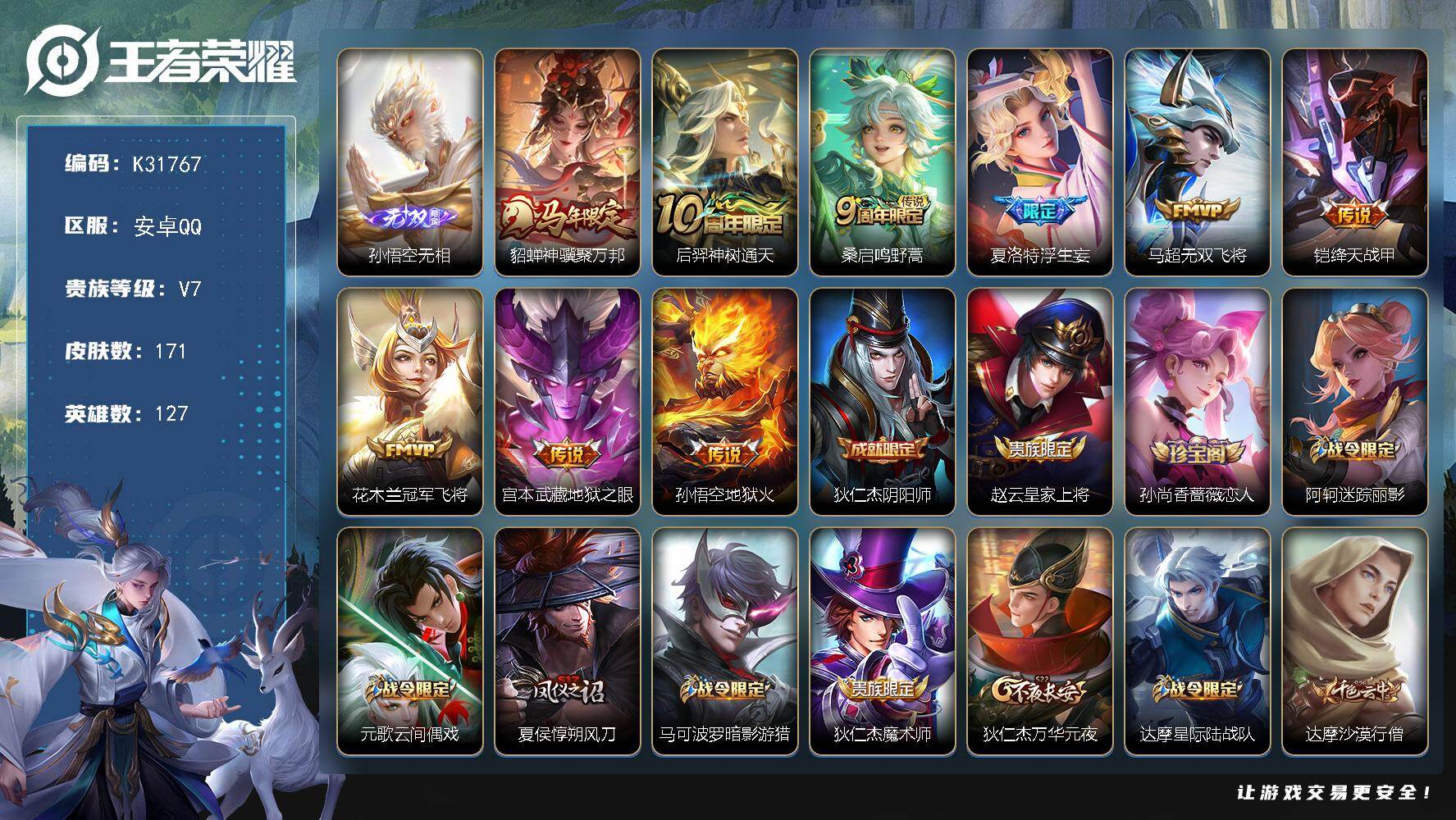 安卓Q-V7-至尊星耀III段位-127英雄-171皮肤-1无双-9传说-41史