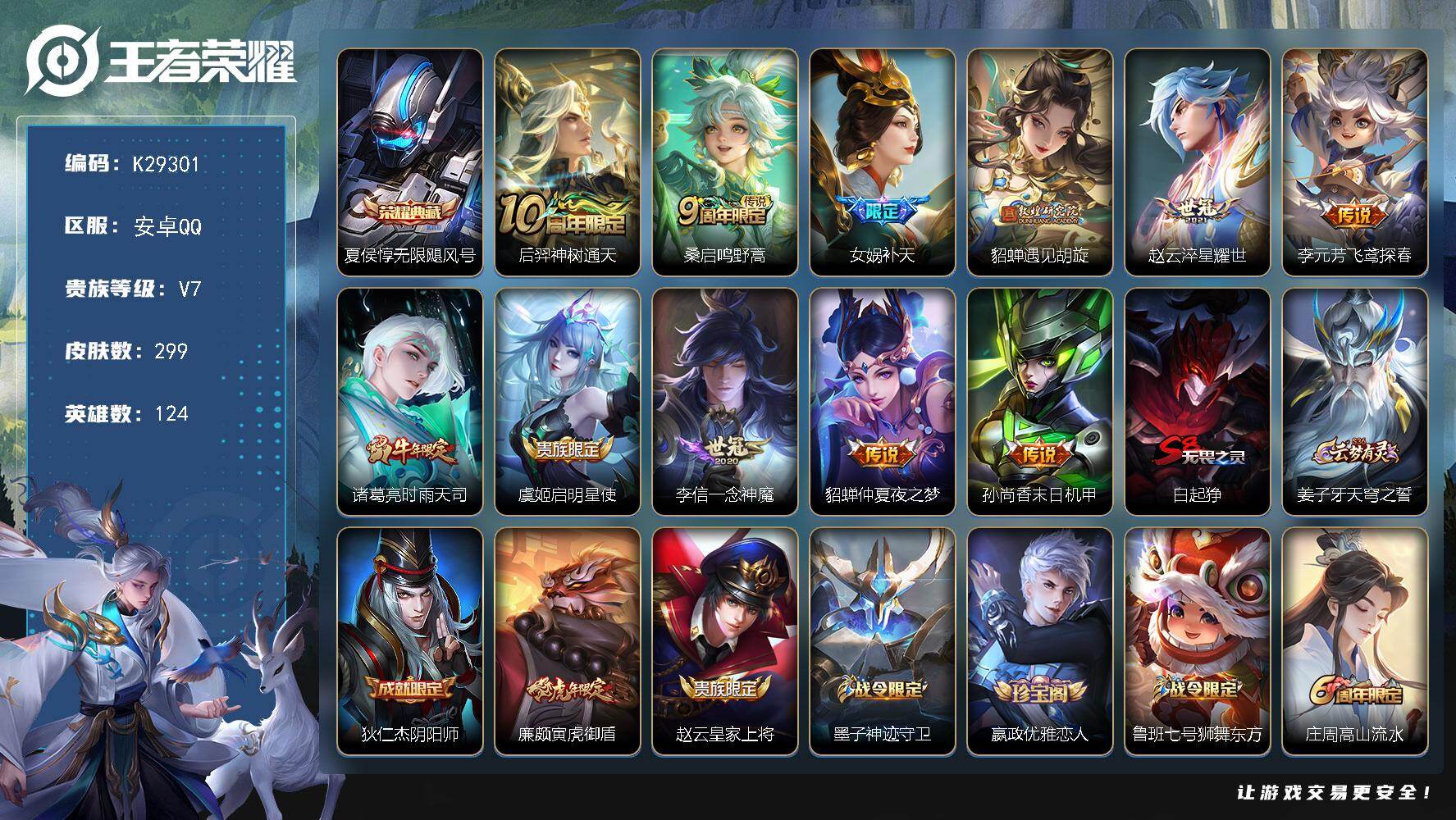 安卓Q-V7-至尊星耀III段位-124英雄-299皮肤-1典藏皮肤-11传说-