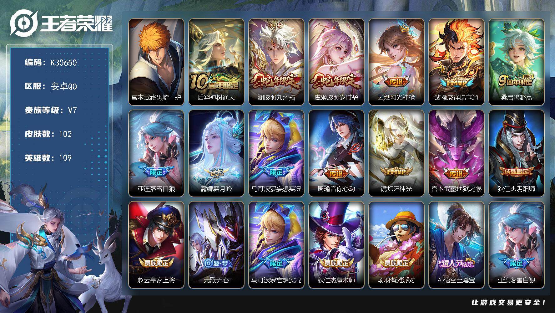 安卓Q-V7-永恒钻石I段位-109英雄-102皮肤-1珍品传说-12传说-25