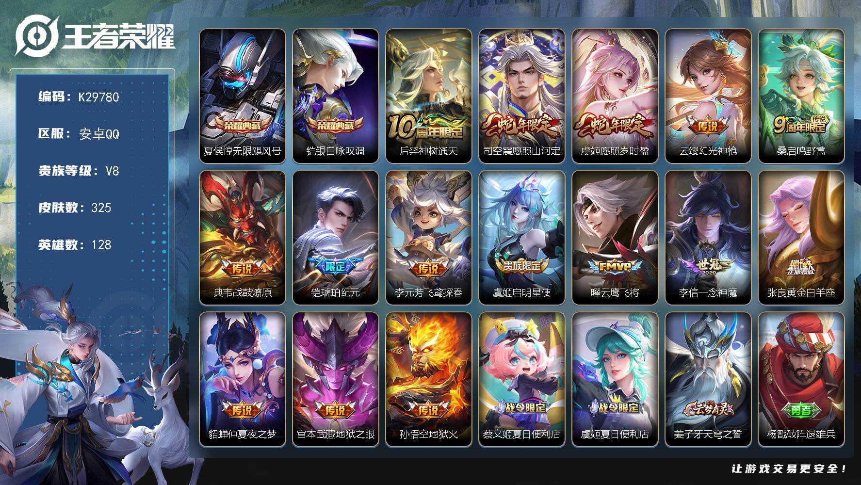安卓Q-V8-至尊星耀V段位-128英雄-325皮肤-2典藏皮肤-15传说-95