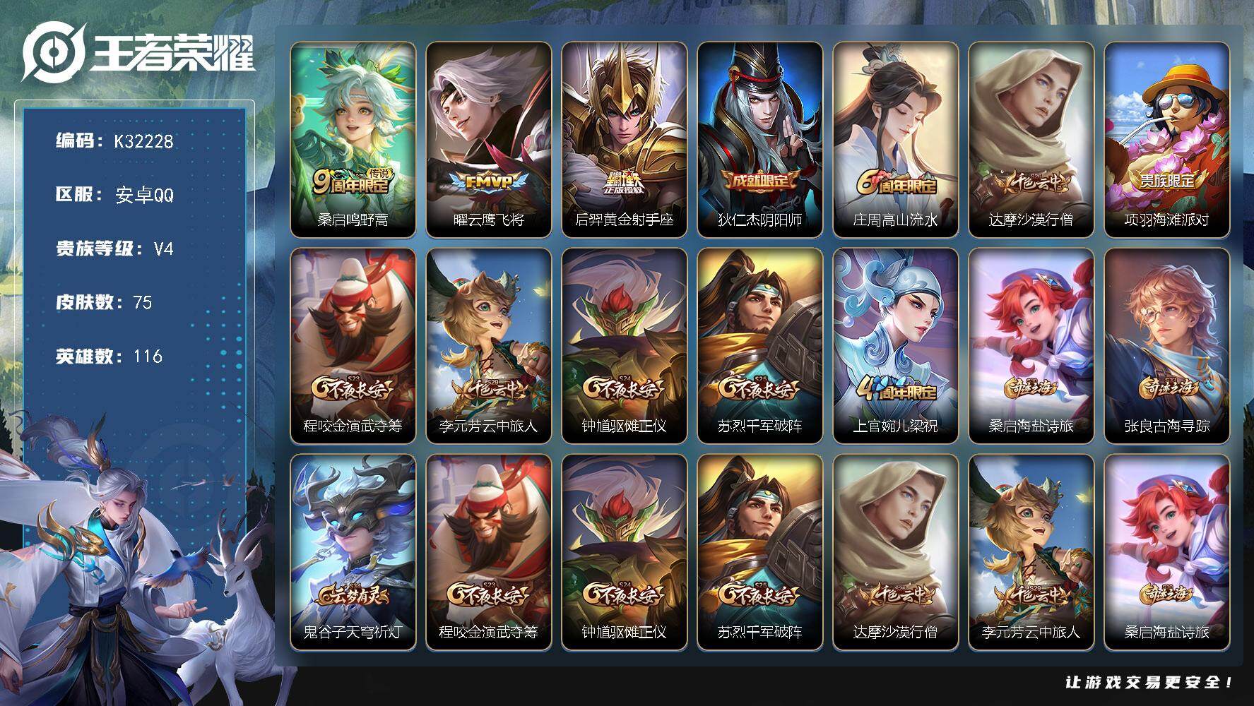 安卓Q-V4-至尊星耀IV段位-116英雄-75皮肤-3传说-17史诗【传说皮