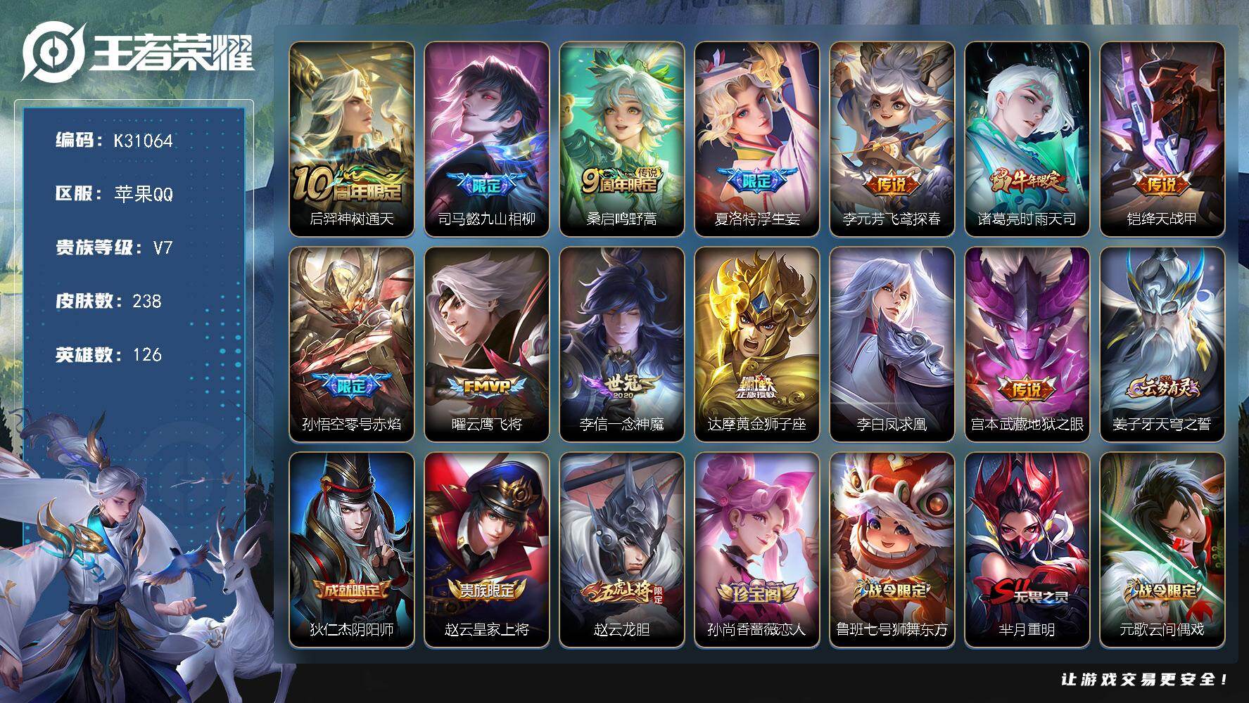苹果Q-V7-至尊星耀V段位-126英雄-238皮肤-13传说-61史诗【英雄