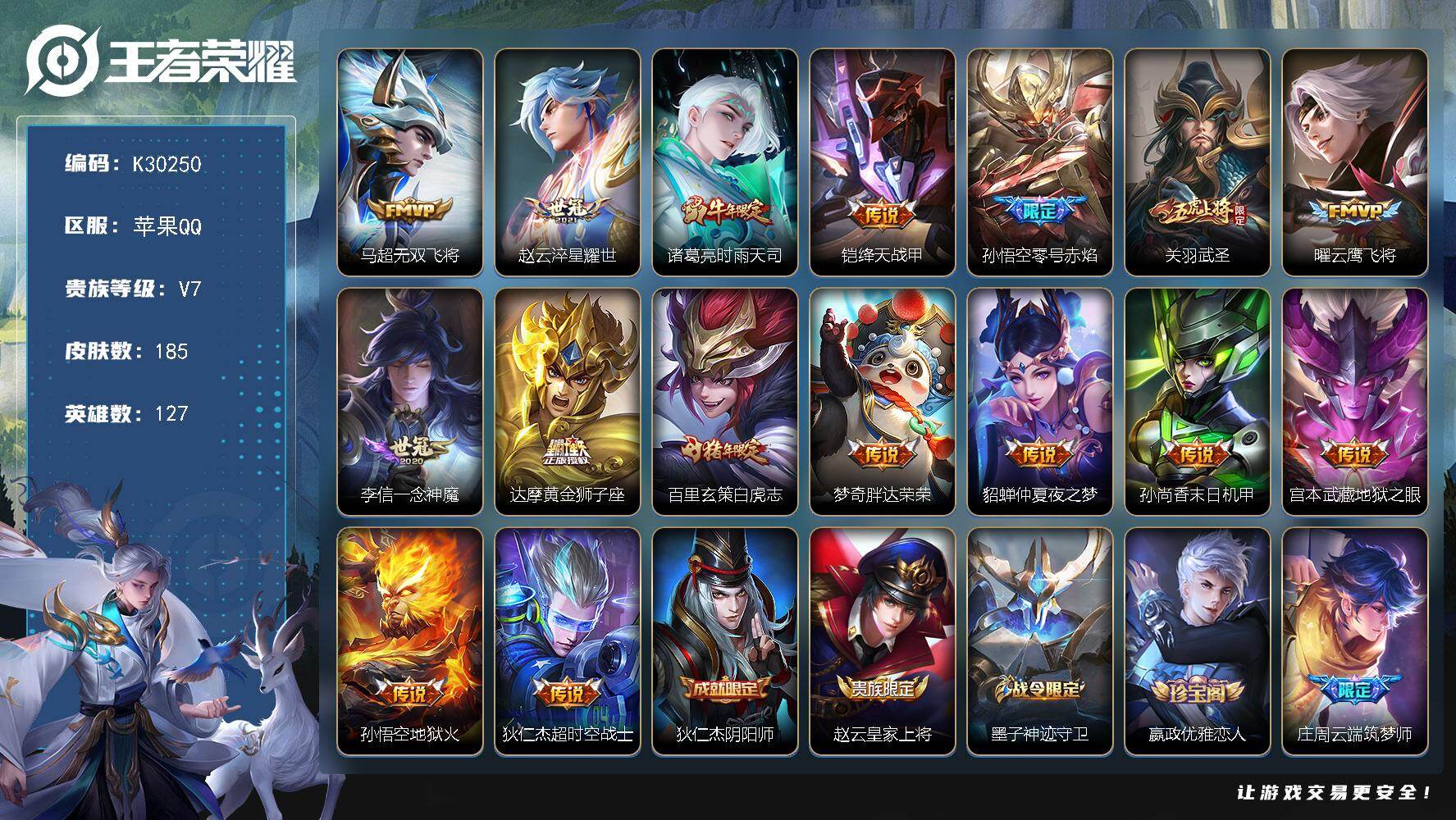 苹果Q-V7-永恒钻石I段位-127英雄-185皮肤-16传说-45史诗【英雄