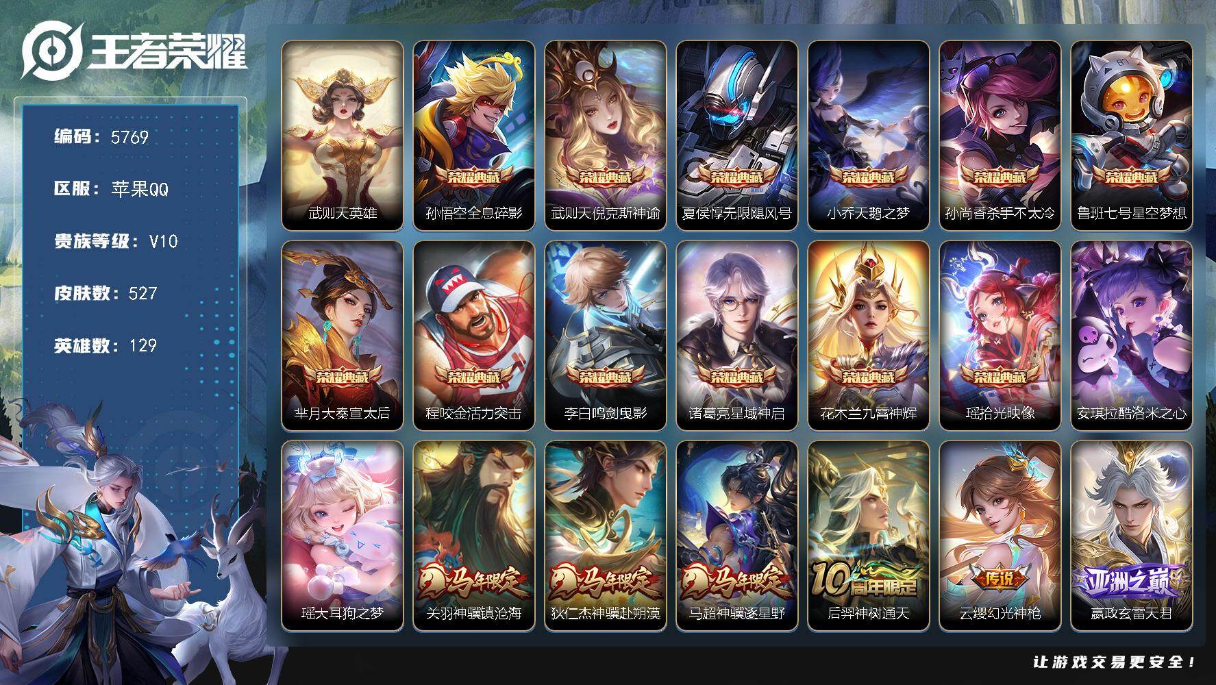 【秒换绑】苹果Q-V9-最强王者段位-128英雄-433皮肤-3典藏皮肤-1无
