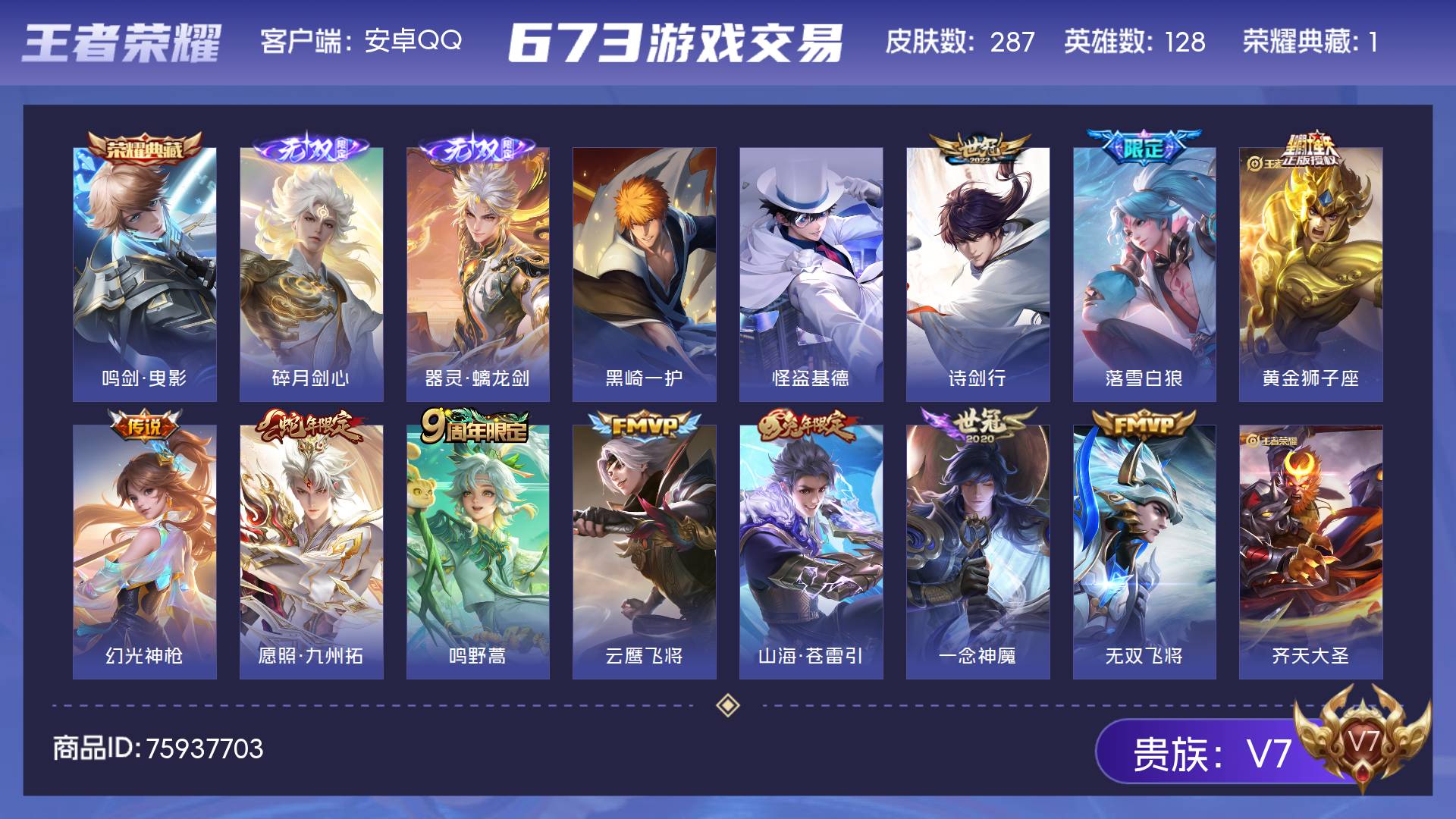 V7 皮肤287 英雄128 至尊星耀 荣耀典藏1 无双皮肤2 珍品传说2 传说11 其他皮肤278