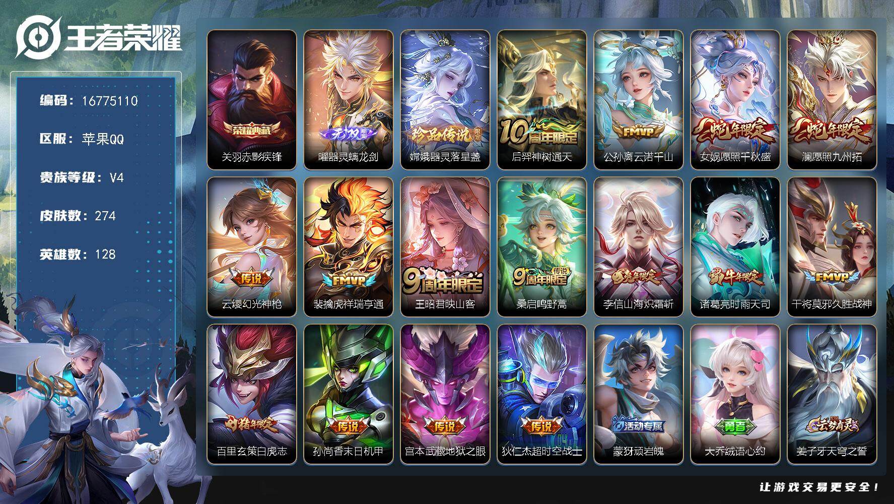 苹果Q-V4-至尊星耀II段位-128英雄-274皮肤-1典藏皮肤-1无双-1珍