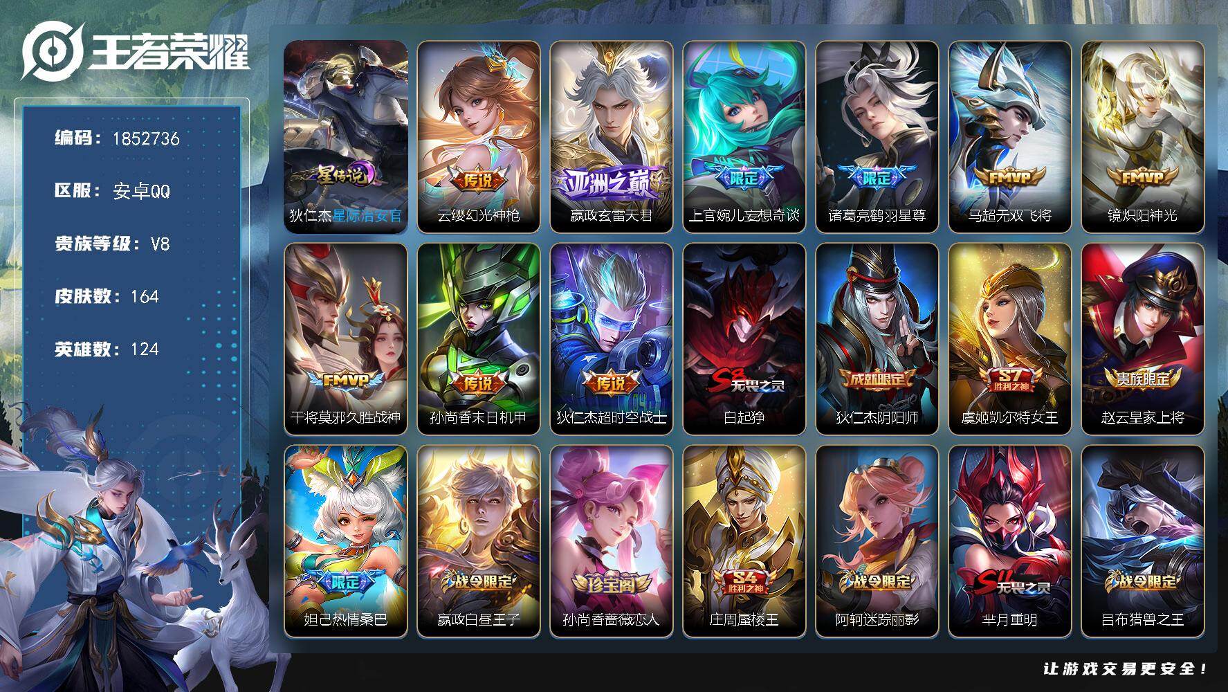 可二次【1水晶1星元8传说可秒换绑】安卓QQ-124英雄-