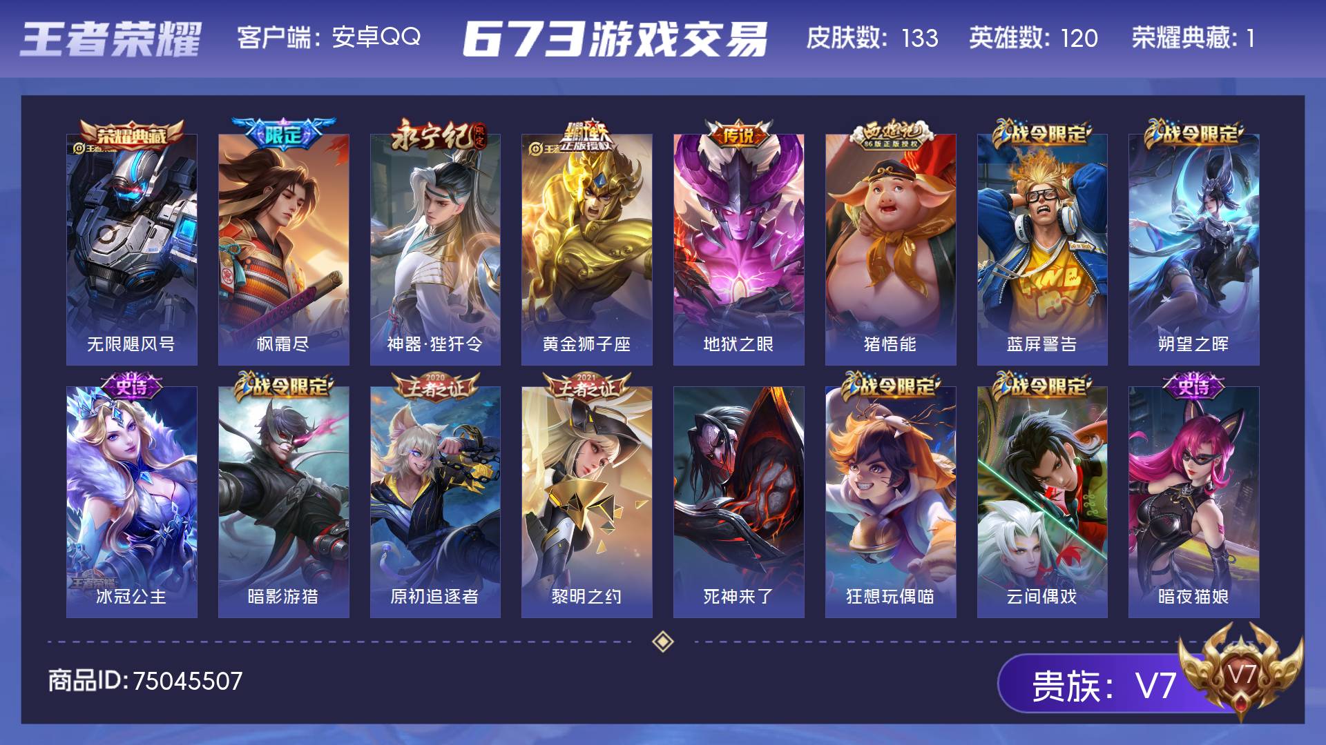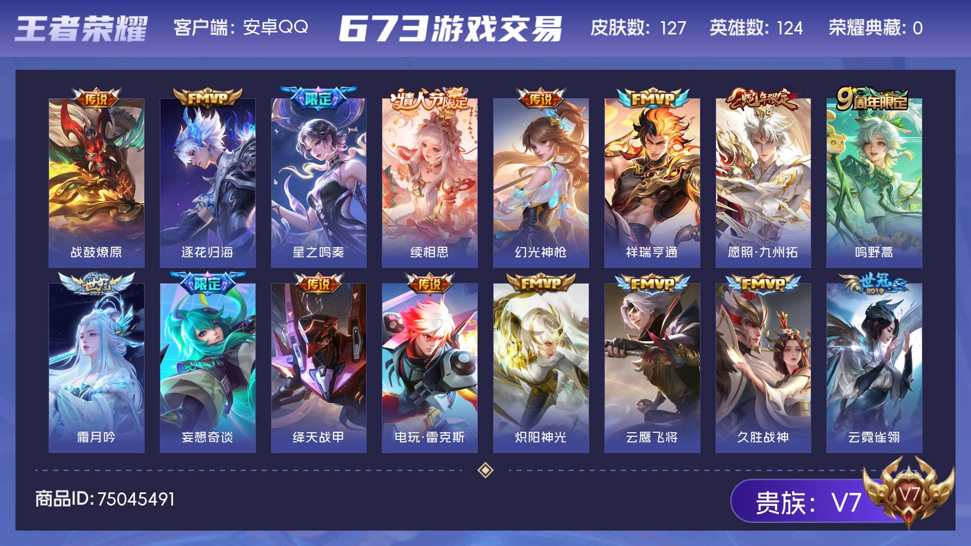 皮肤127 英雄124 永恒钻石 传说16 其他皮肤29-GT131 野王号 热门:16传说2星传说安卓Q-V7-钻石-123英雄-127皮肤-0典藏-0无双-0珍品传说-16传说-24史诗【