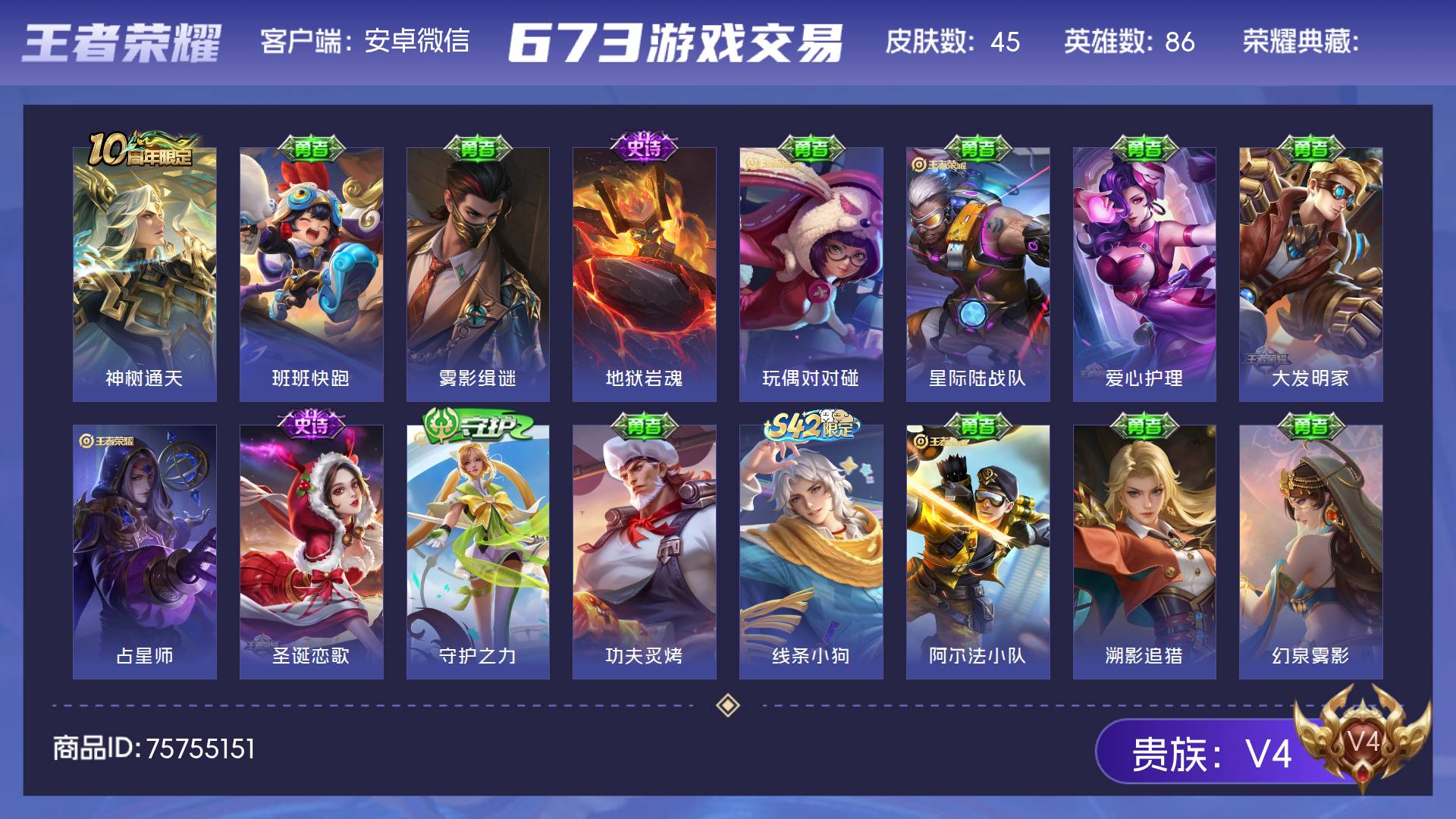 V4 皮肤45 英雄86 至尊星耀 传说1 其他皮肤50