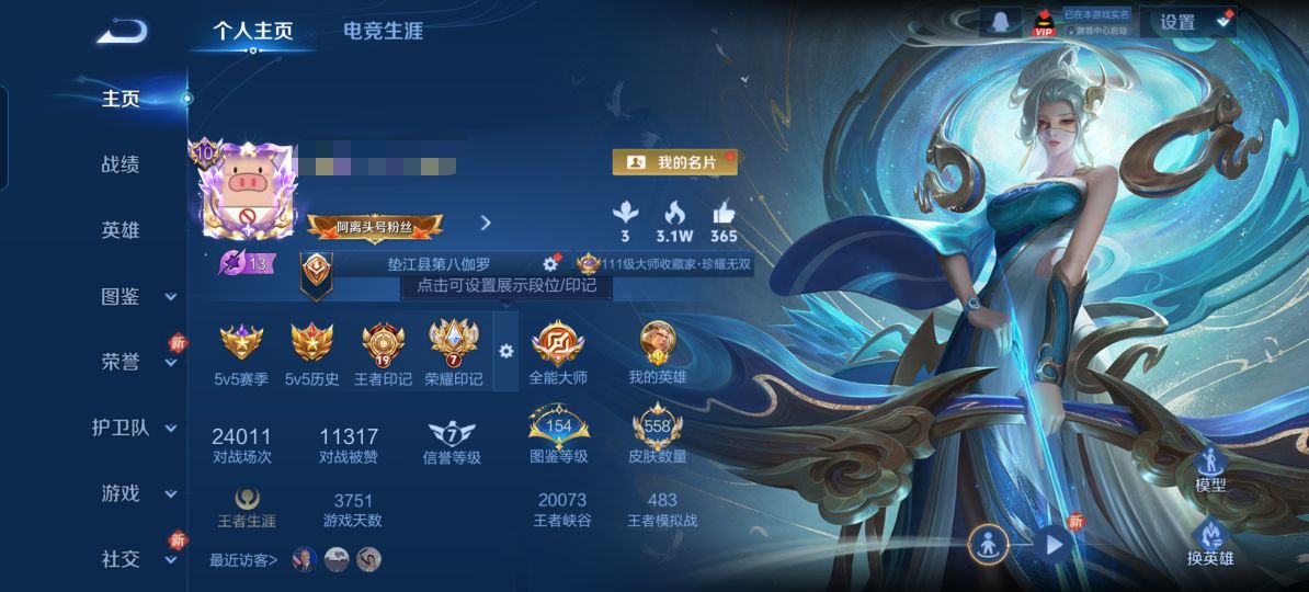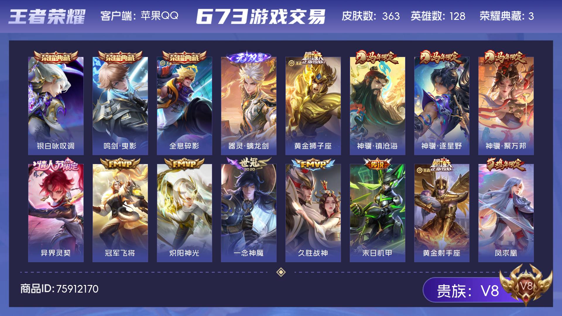 V8 皮肤363 英雄128 至尊星耀 荣耀典藏3 无双皮肤1 传说19 其他皮肤346