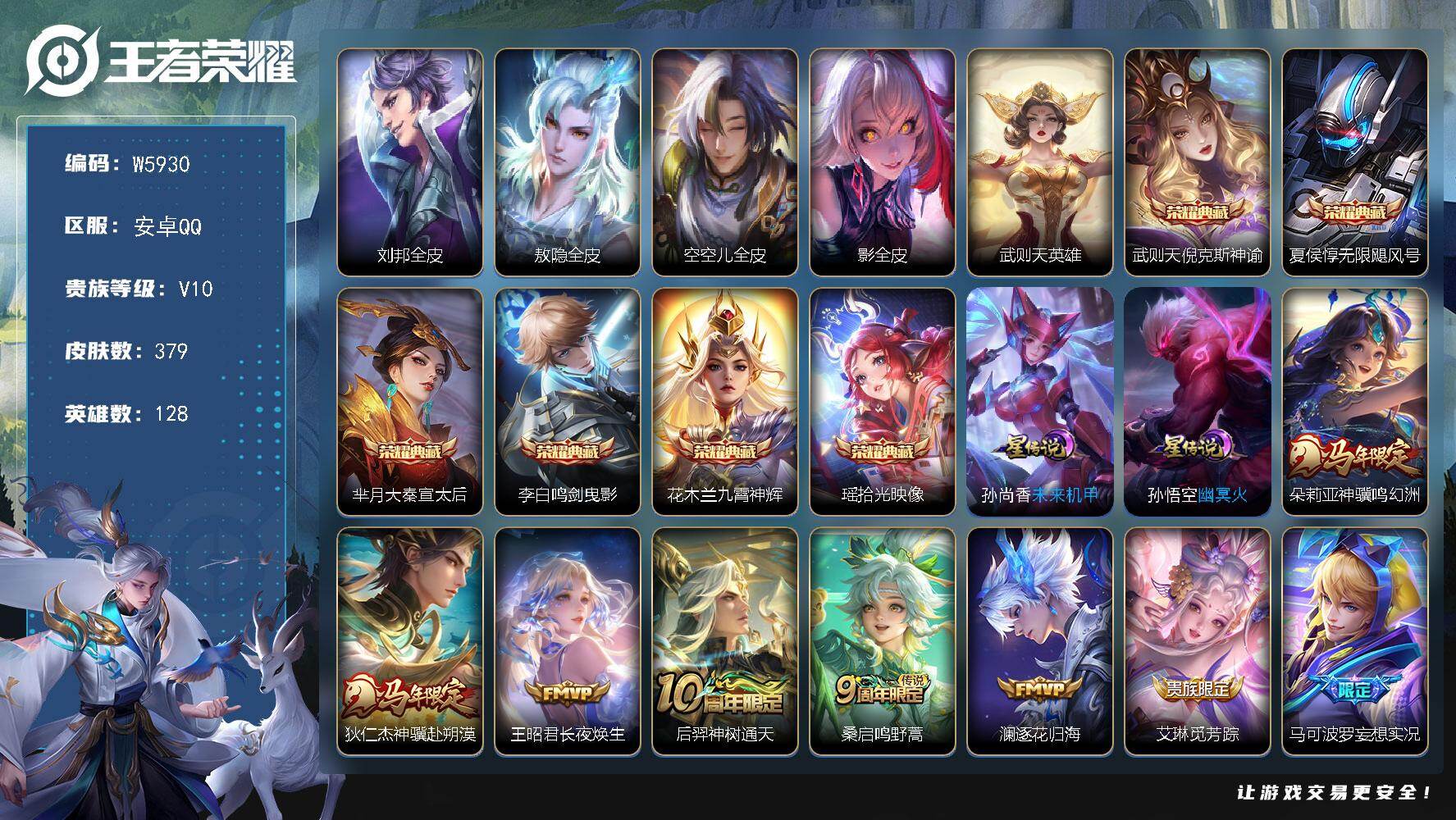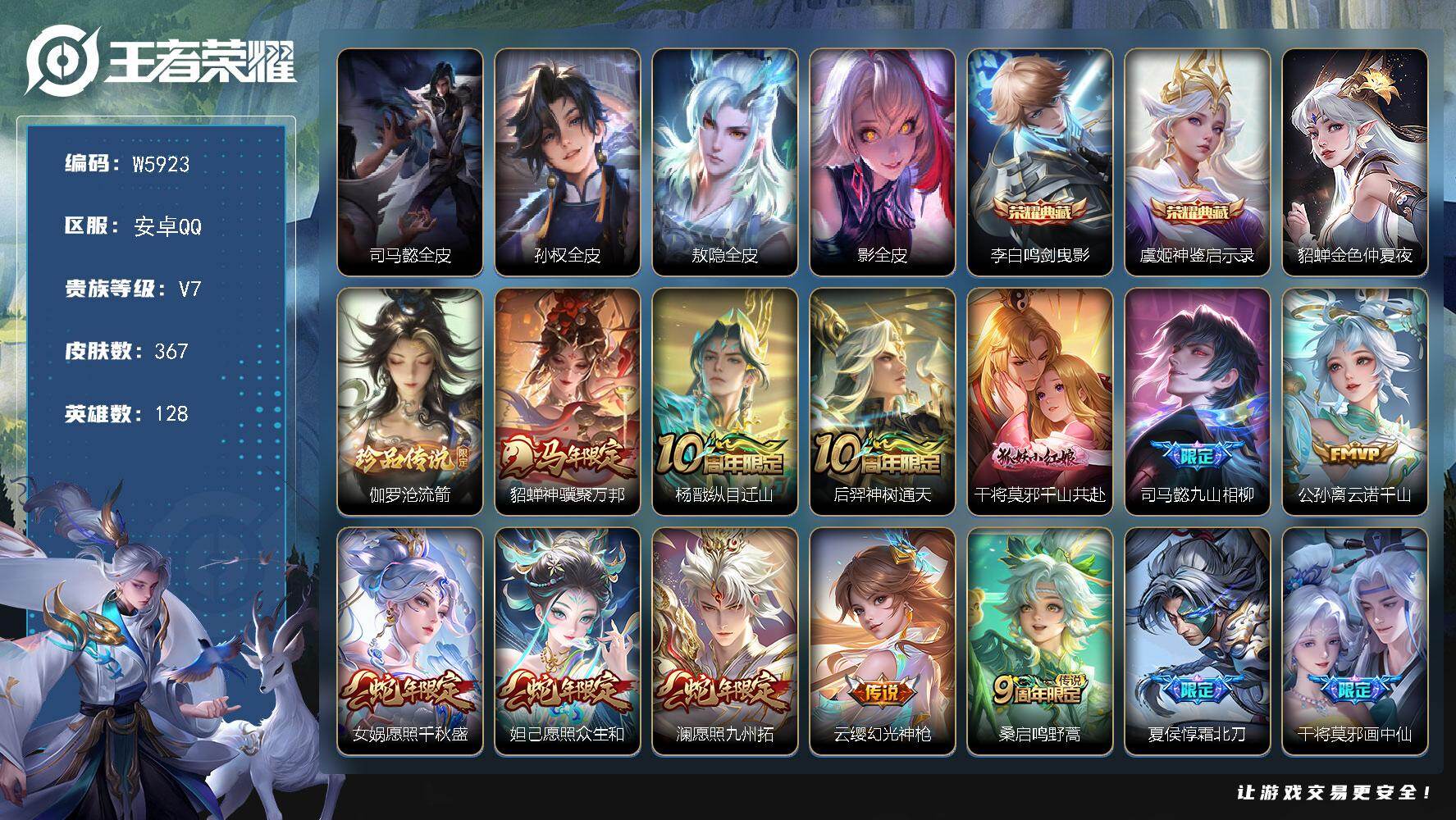 【W5923】伽罗沧流箭-安卓QQ-有二次-贵7-128英雄-367皮肤-2典藏
