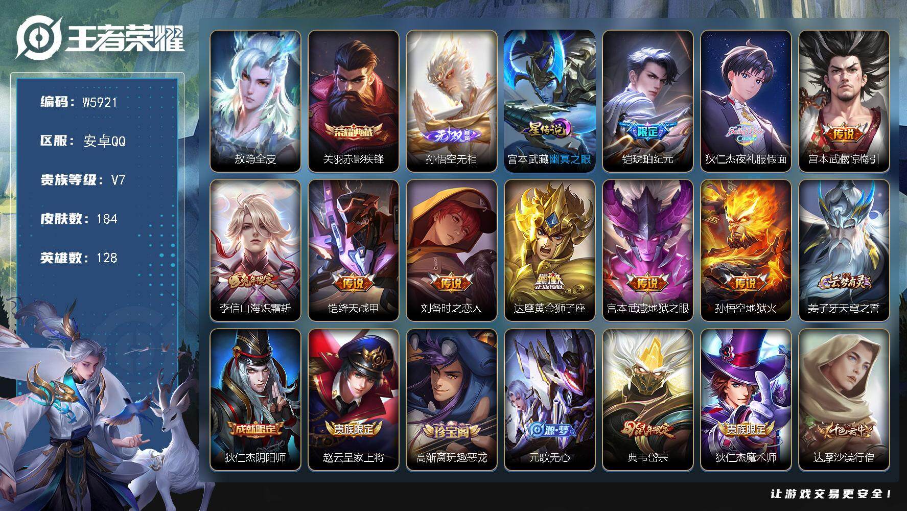 【亮点:5.1K场次】安卓Q-可二次-贵6-127英雄-185皮肤