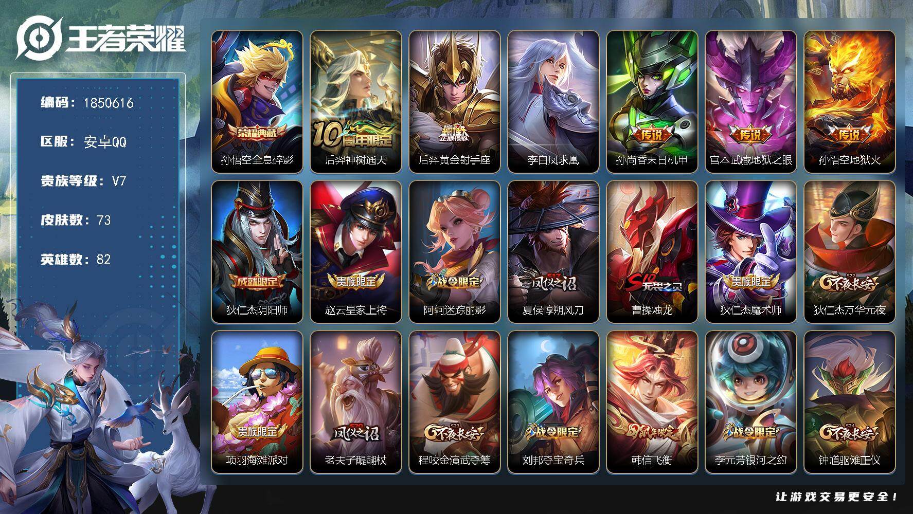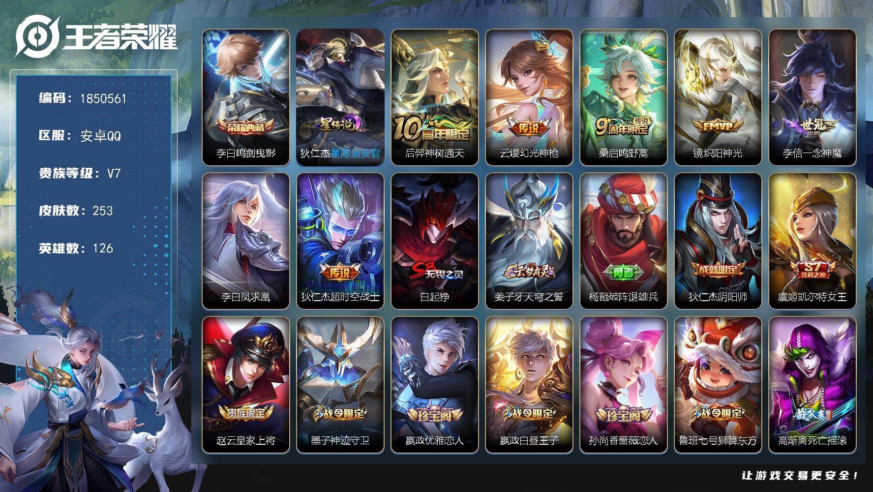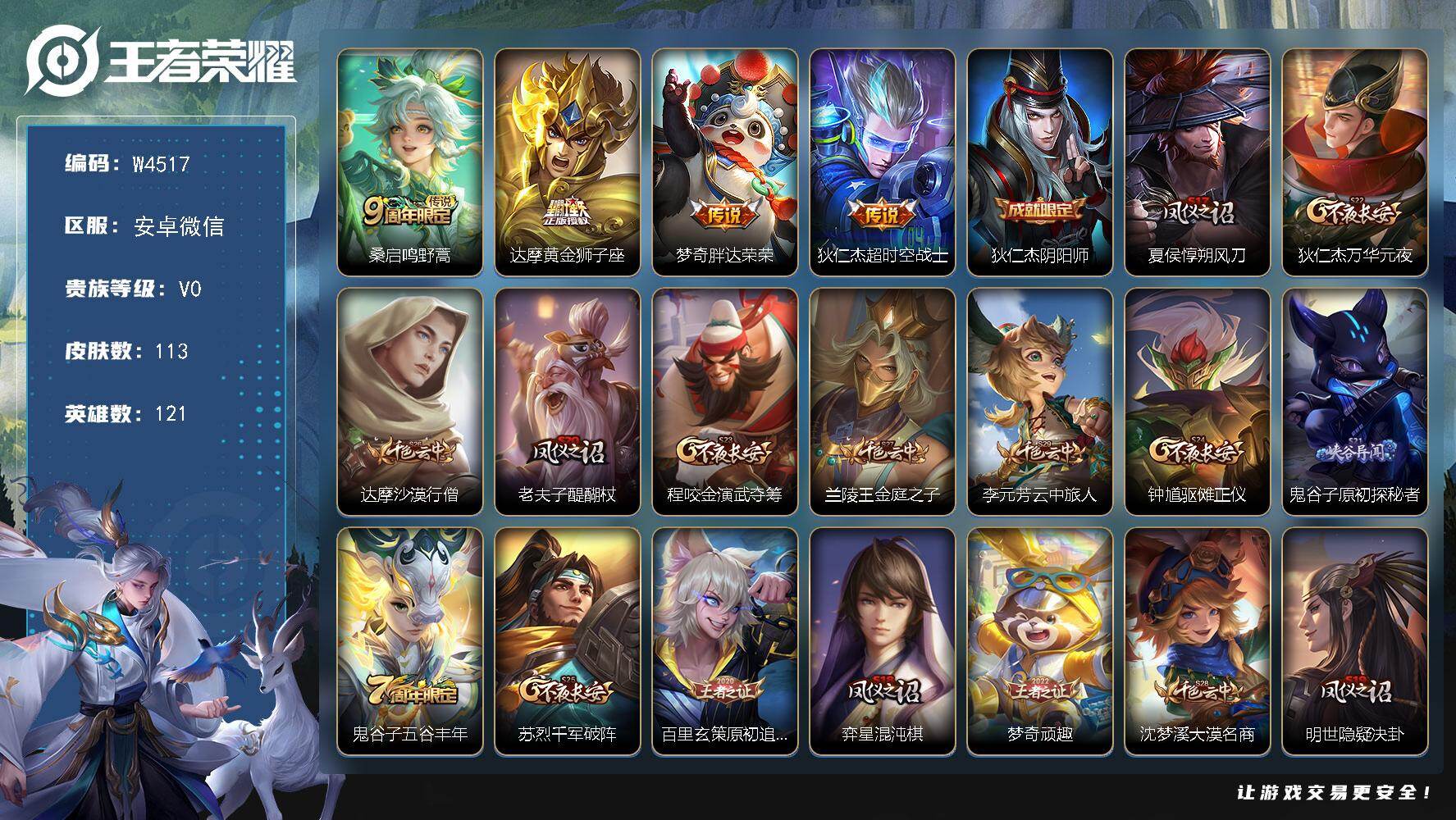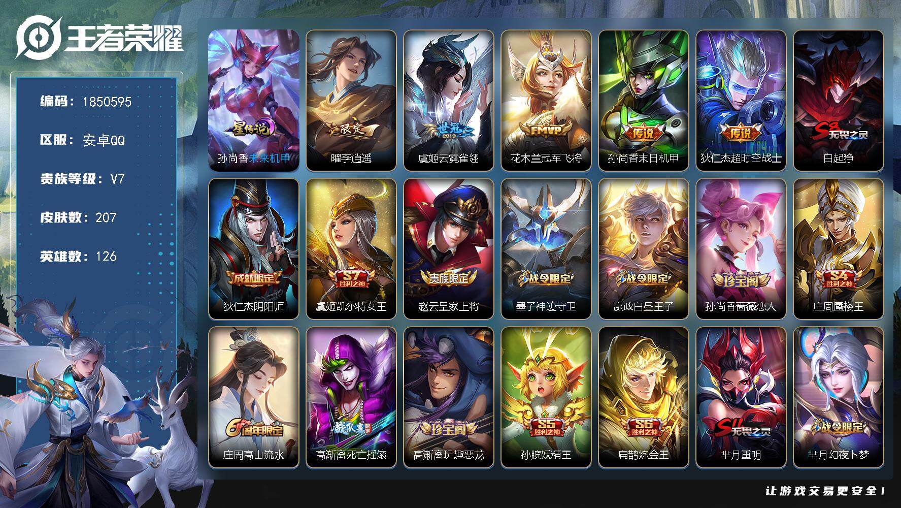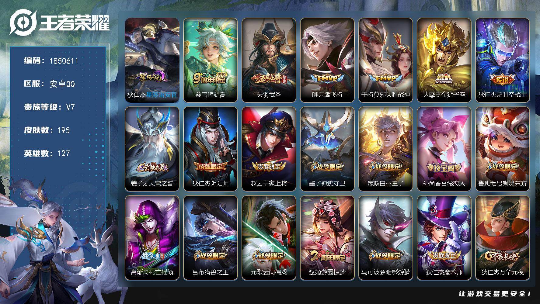 安卓QQ/荣耀王者/339皮肤/127英雄/1典藏/0珍品无双/3无双/2珍品传说/33传说/112