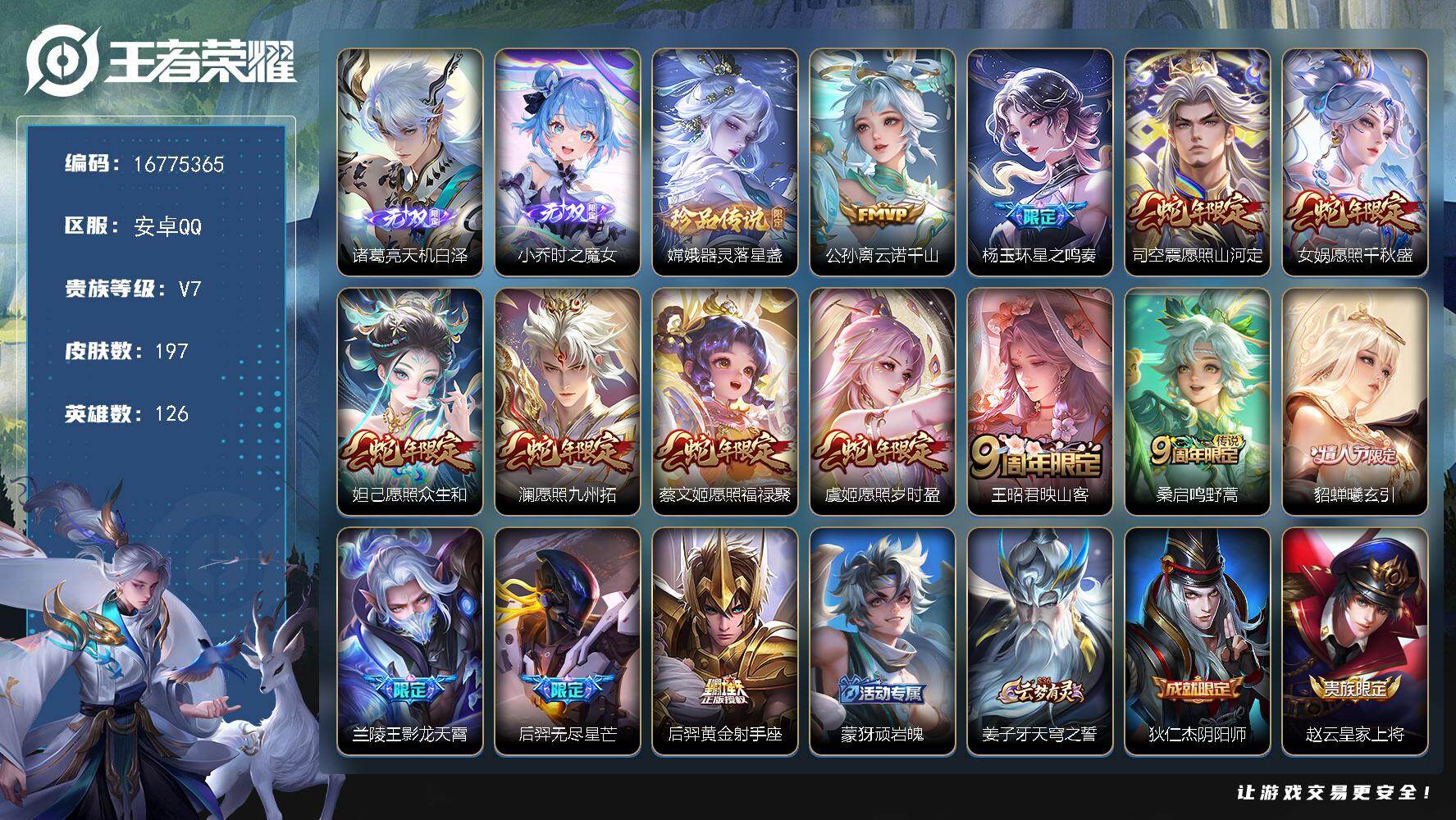 安卓Q-V7-最强王者段位-126英雄-197皮肤-2无双-1珍品传说-14传说