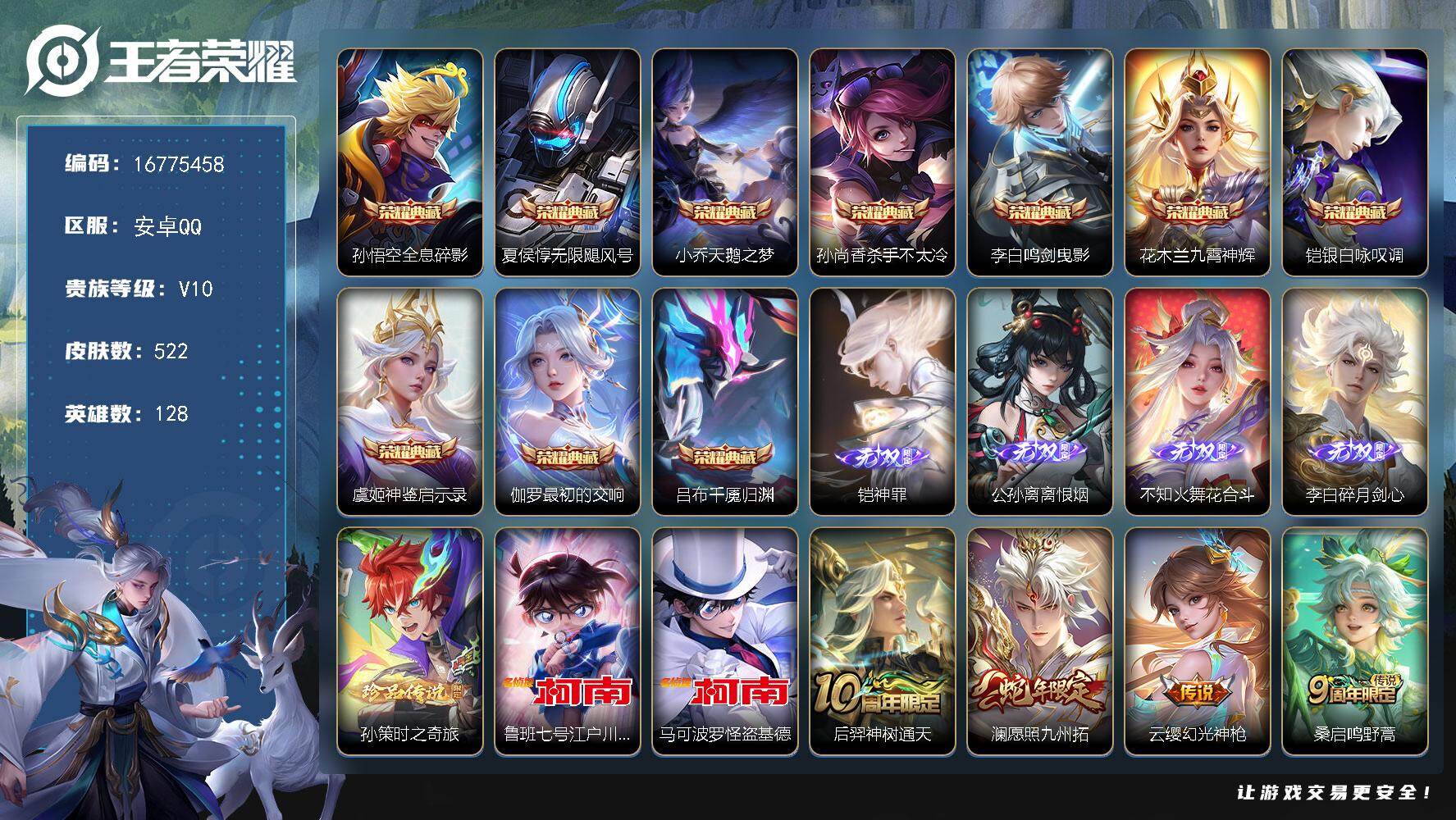 安卓Q-V10-最强王者段位-128英雄-522皮肤-10典藏皮肤-4无双-3珍