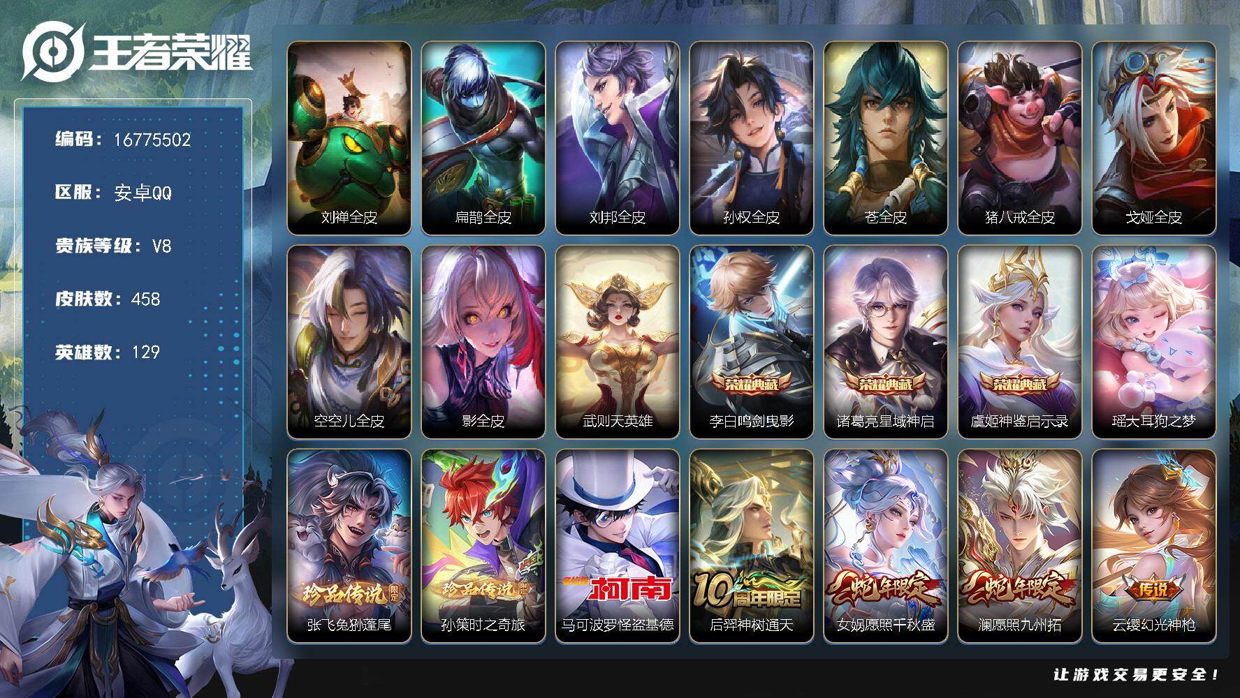 安卓Q-V8-至尊星耀II段位-129英雄-458皮肤-3典藏皮肤-1典藏英雄-