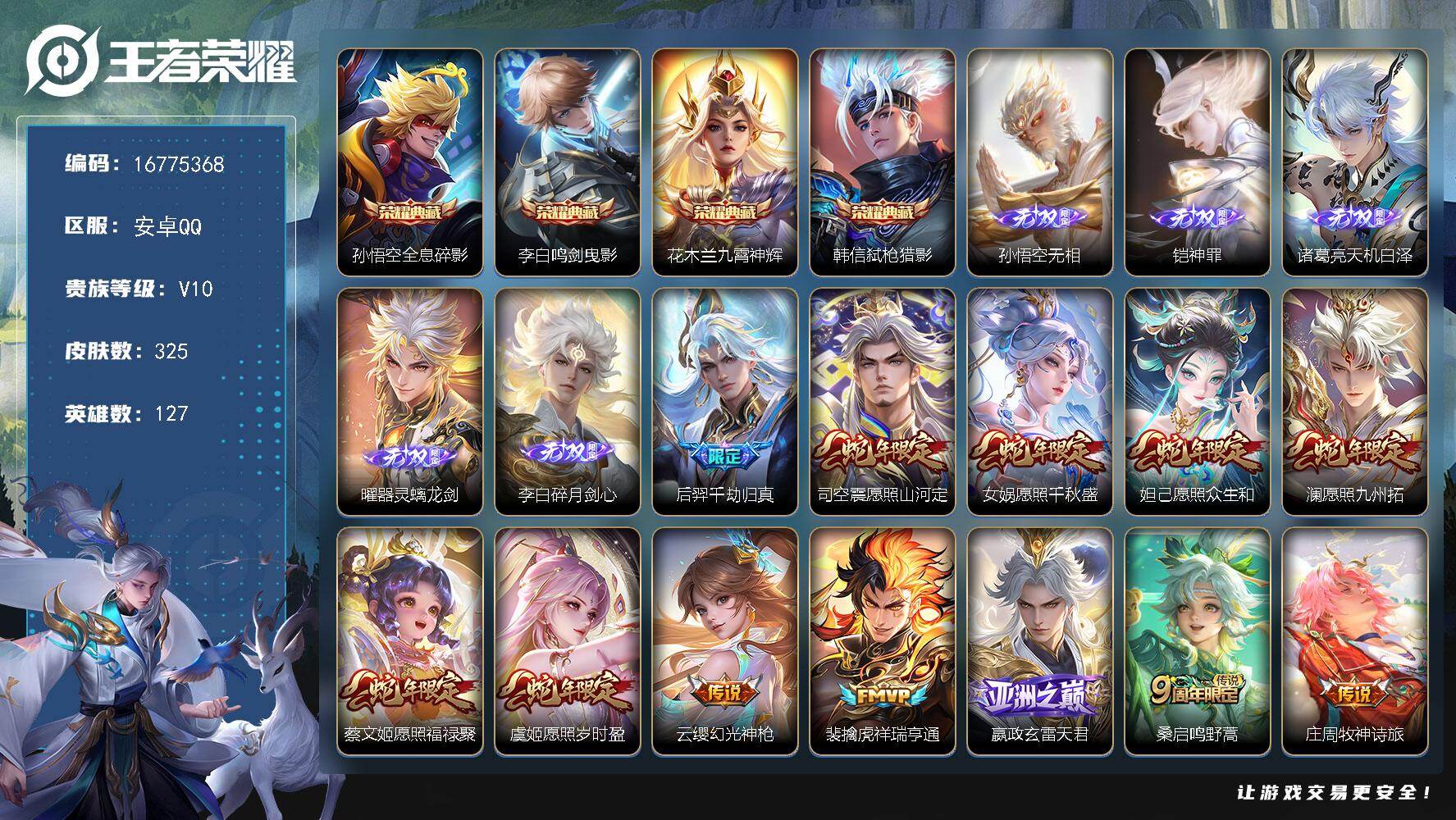安卓Q-V10-最强王者段位-127英雄-325皮肤-4典藏皮肤-5无双-52传