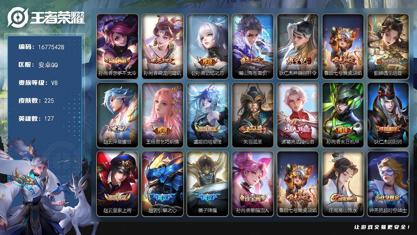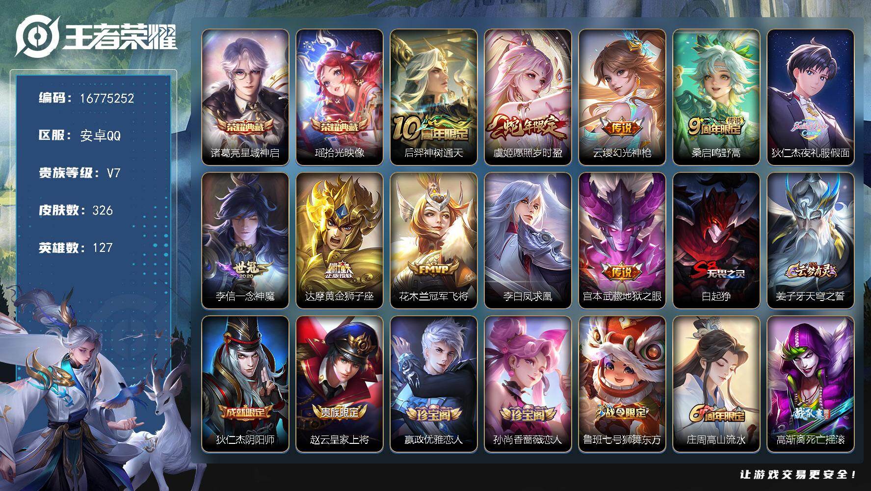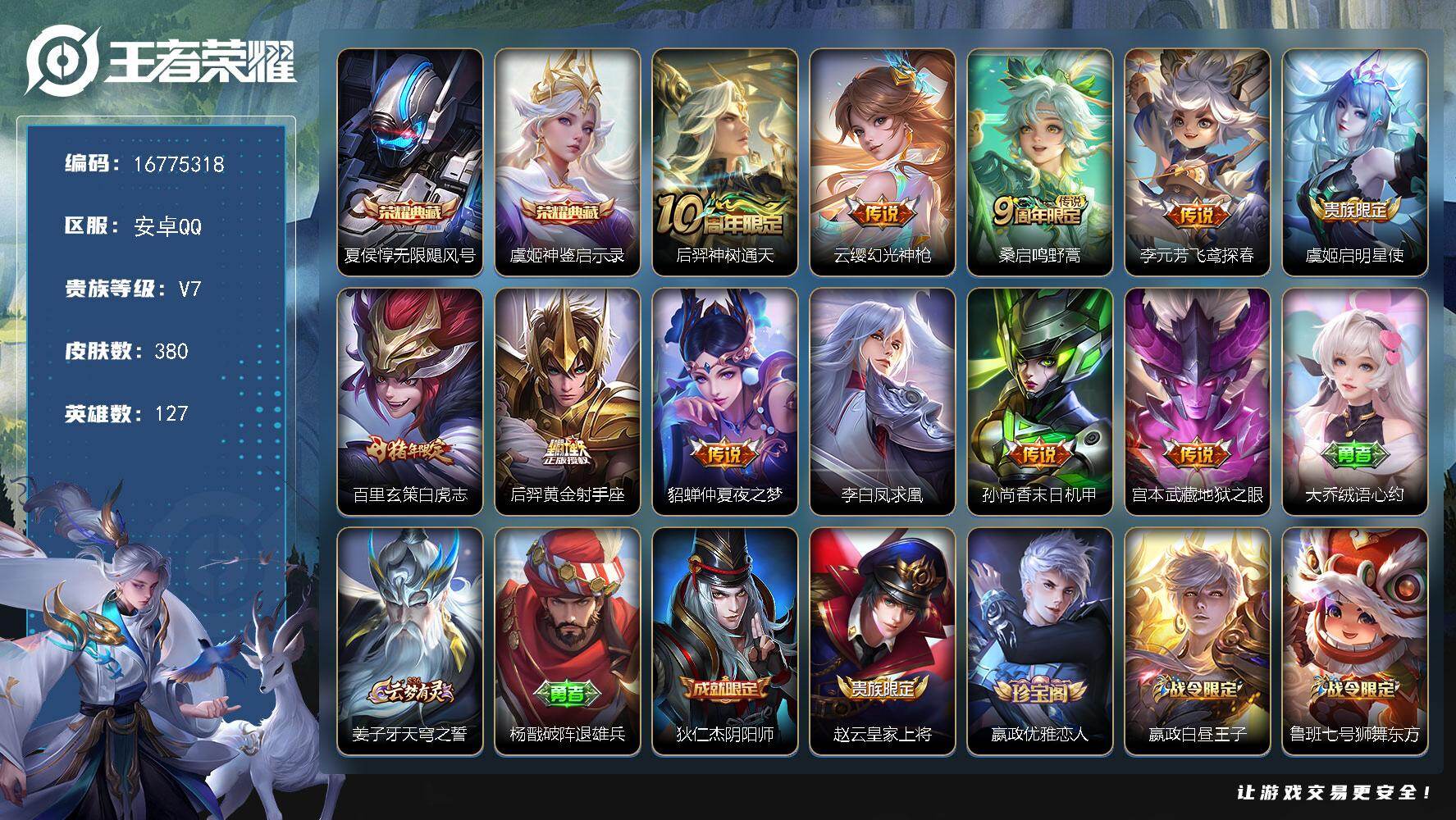 安卓Q-V7-永恒钻石II段位-127英雄-380皮肤-2典藏皮肤-11传说-1