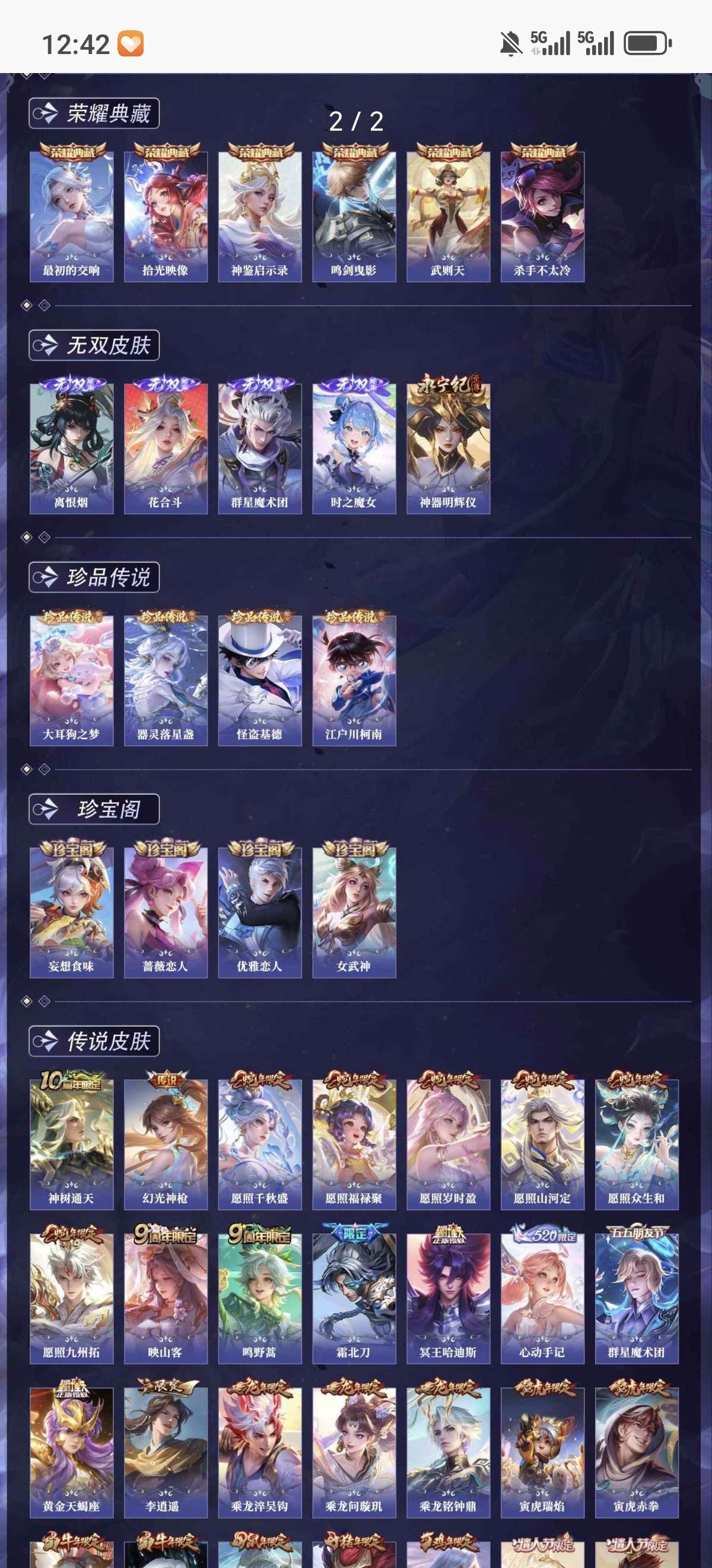 贵族10 荣耀典藏6 无双5 珍品传说4 传说皮肤72 史诗皮肤211 皮肤数量602