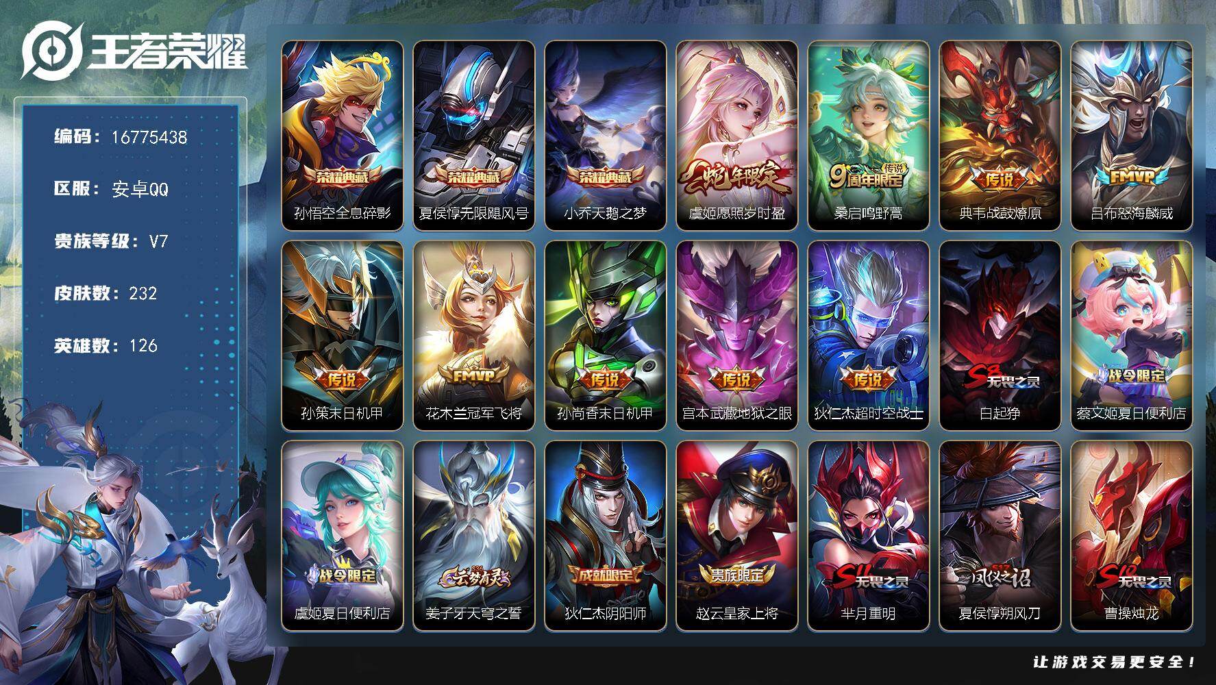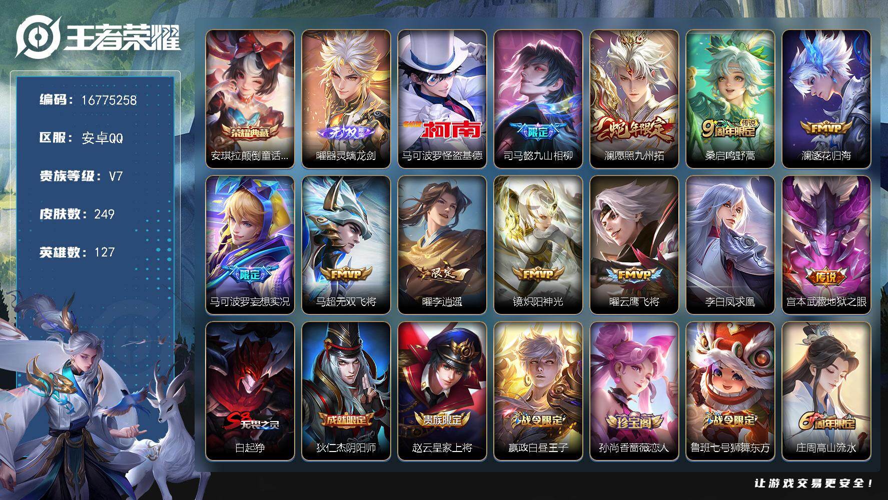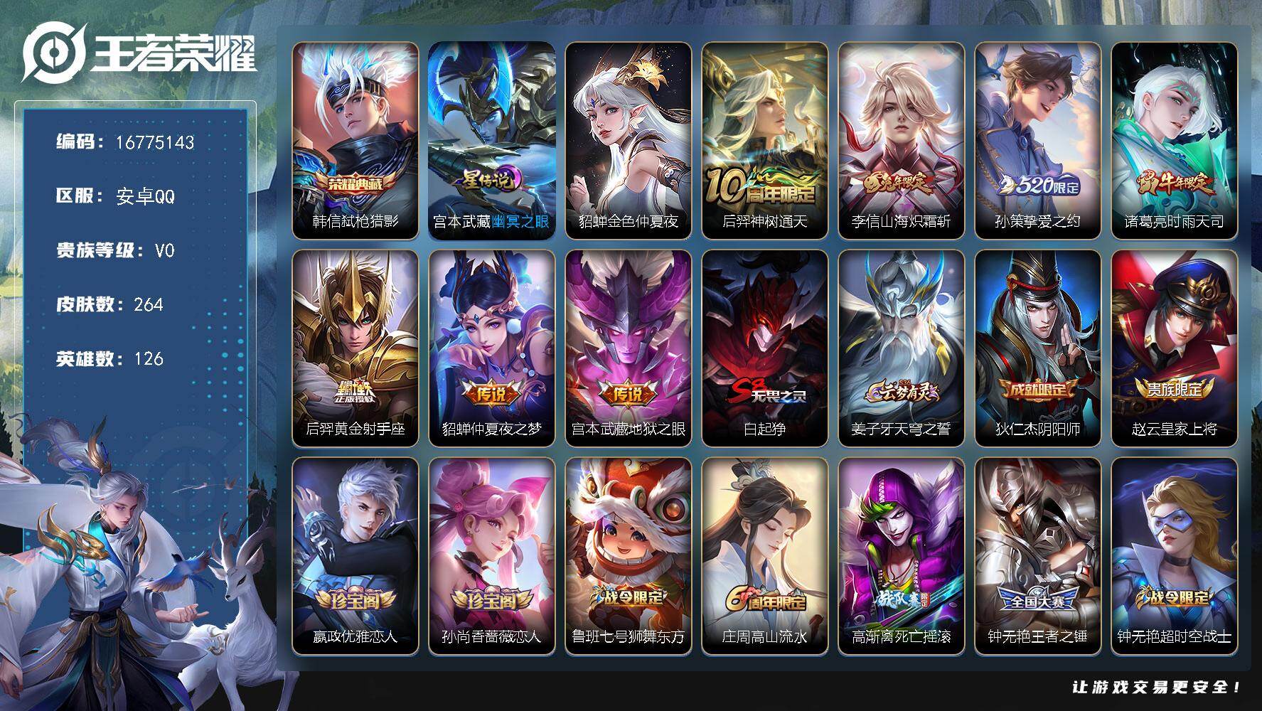 安卓Q-V7-至尊星耀IV段位-125英雄-260皮肤-1典藏皮肤-2珍品传说-
