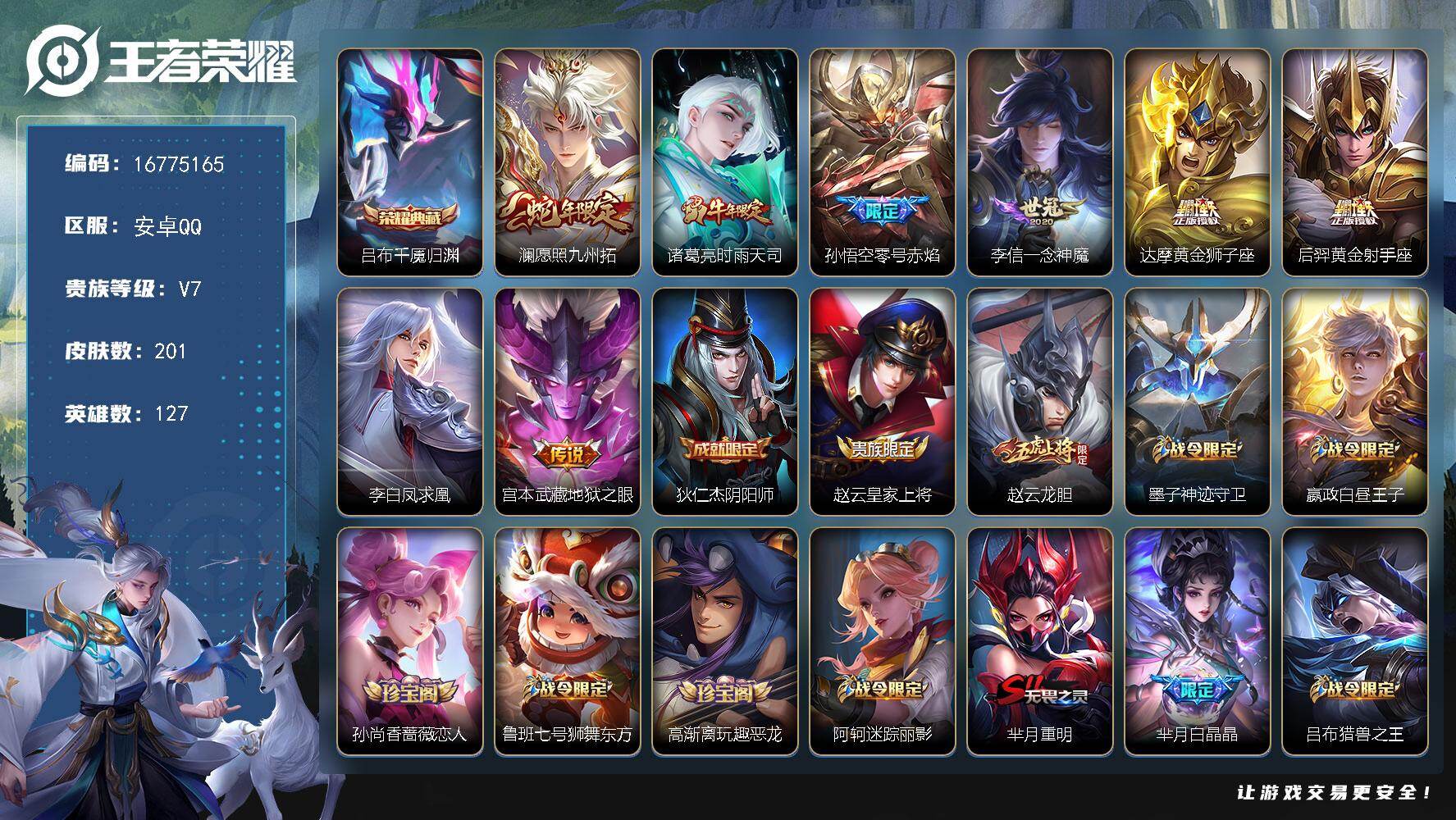 安卓Q-V0-尊贵铂金I段位-127英雄-201皮肤-1典藏皮肤-8传说-57史