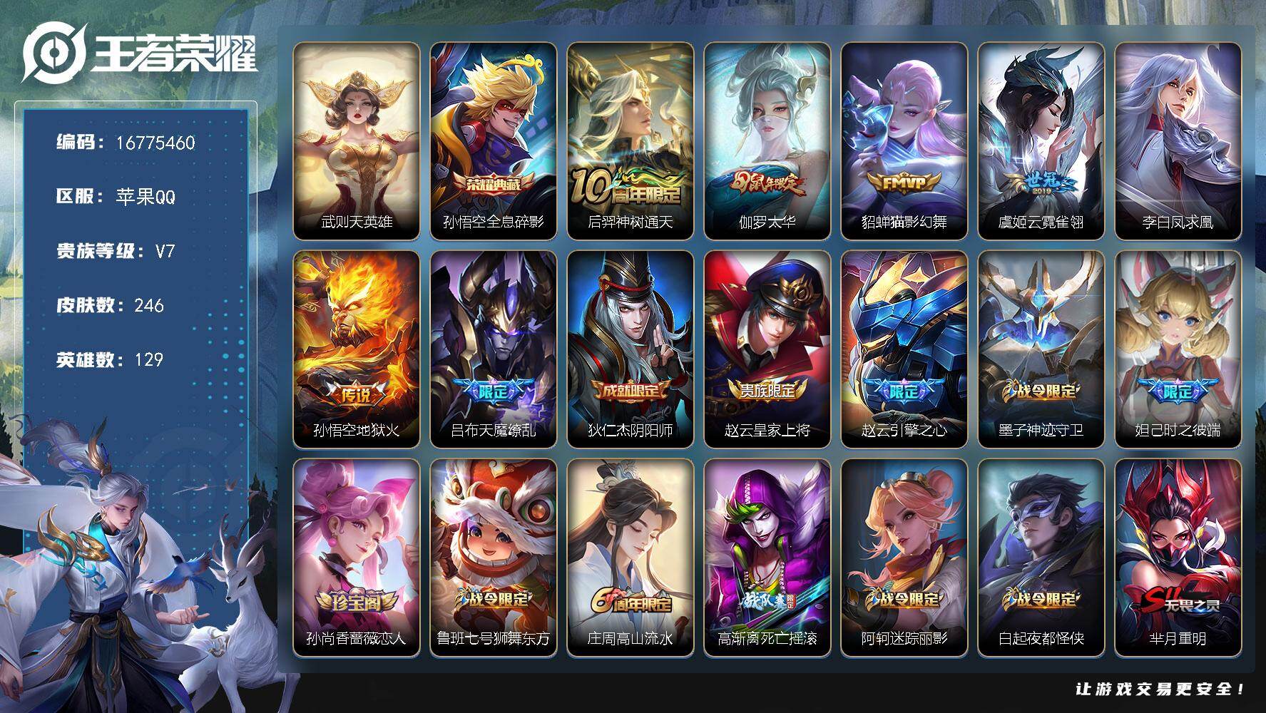 苹果Q-V7-尊贵铂金II段位-129英雄-246皮肤-1典藏皮肤-1典藏英雄-