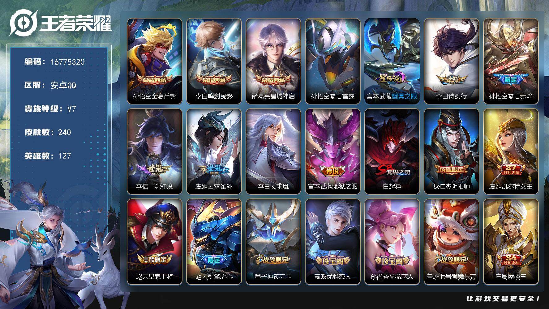 V7-至尊星耀II段位-127英雄-240皮肤-3典藏皮肤-6传说