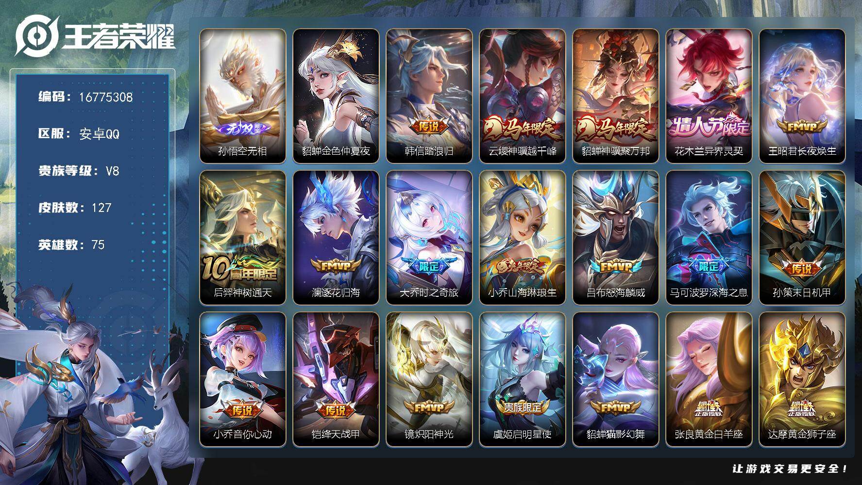 安卓Q-V8-最强王者段位-75英雄-127皮肤-1无双-23传说-33史诗【