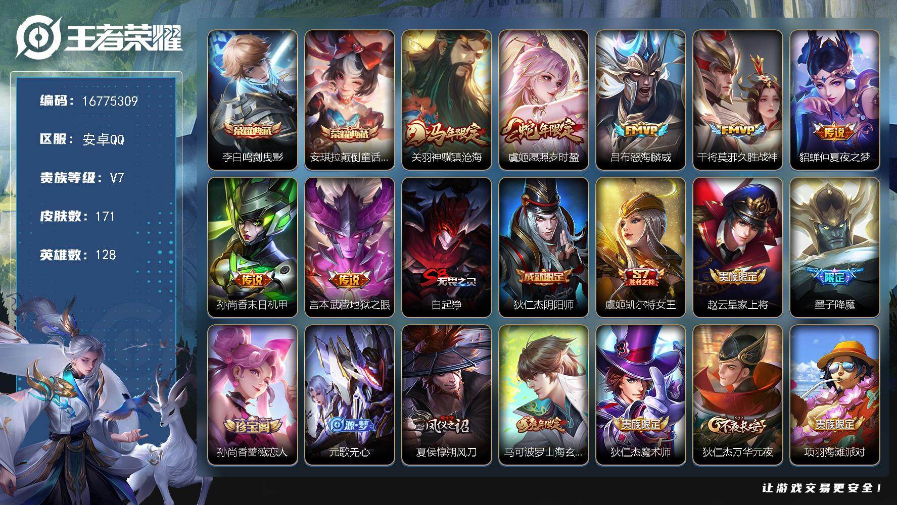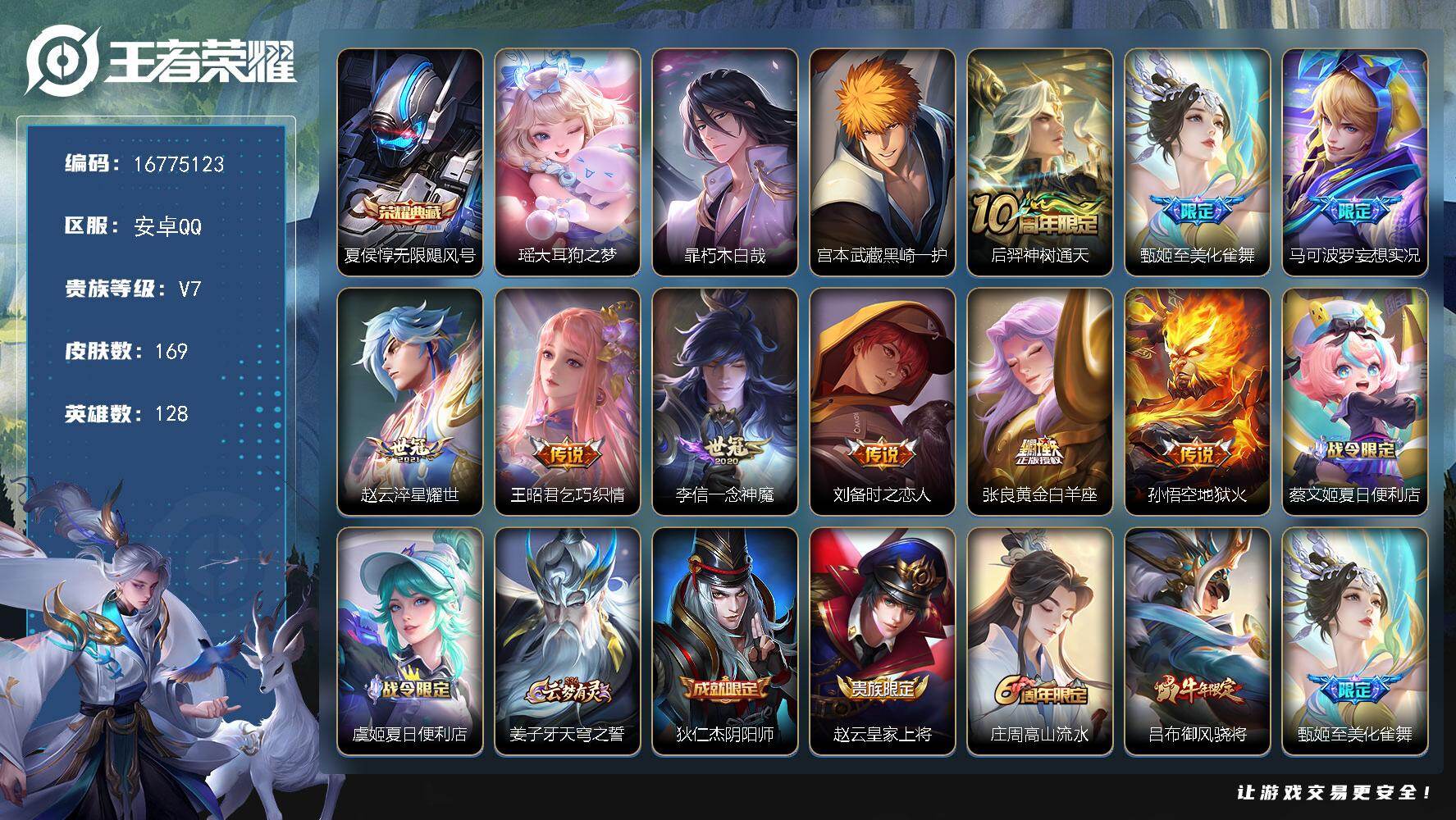 安卓Q-V7-最强王者段位-128英雄-169皮肤-1典藏皮肤-3珍品传说-9传