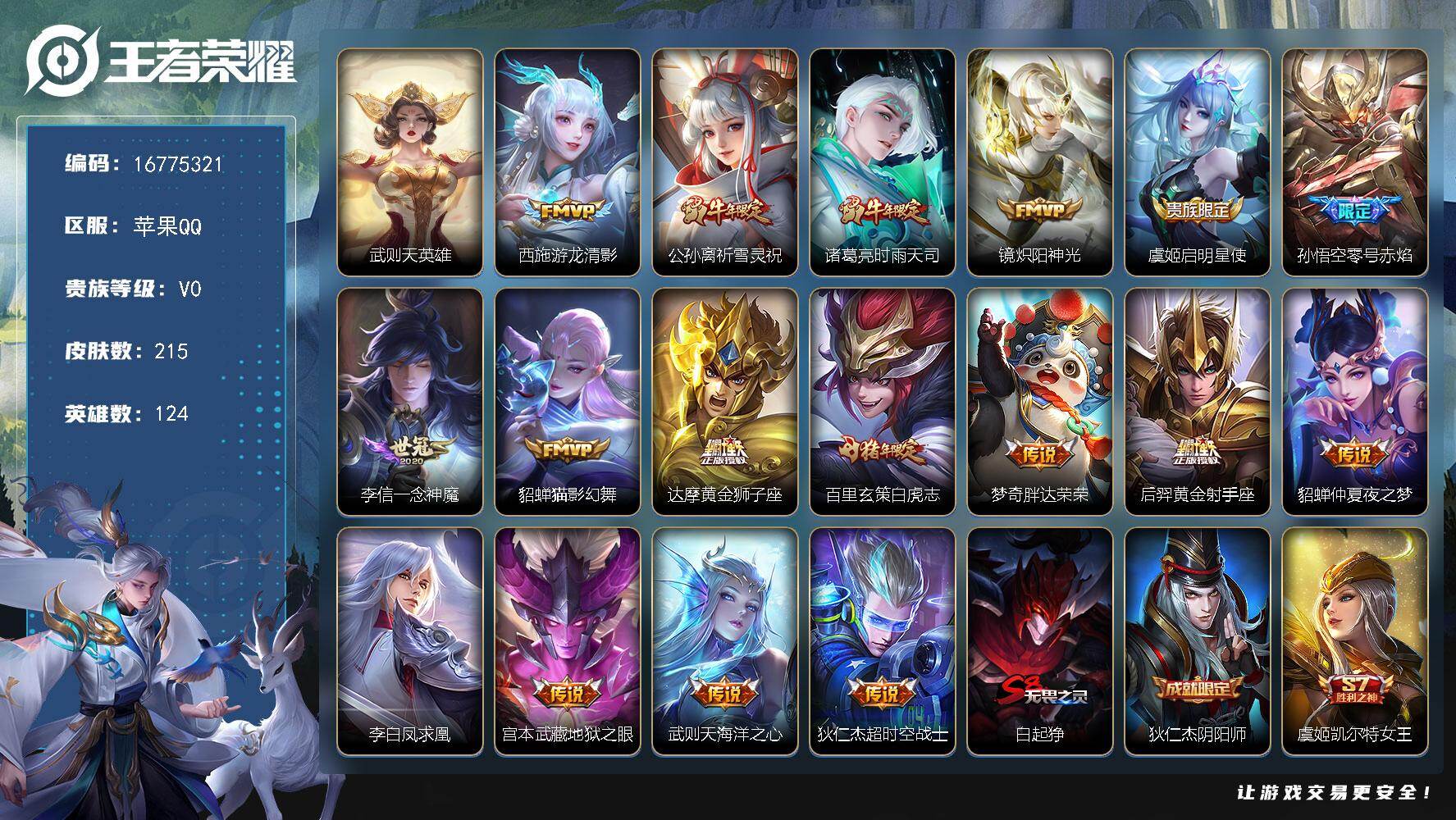苹果Q-V0-荣耀黄金IV段位-124英雄-215皮肤-1典藏英雄-17传说-6