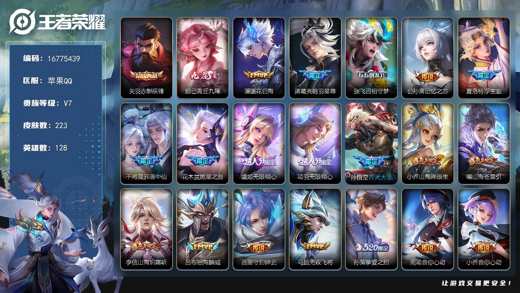 苹果Q-V3-至尊星耀V段位-128英雄-223皮肤-1典藏皮肤-1无双-26传