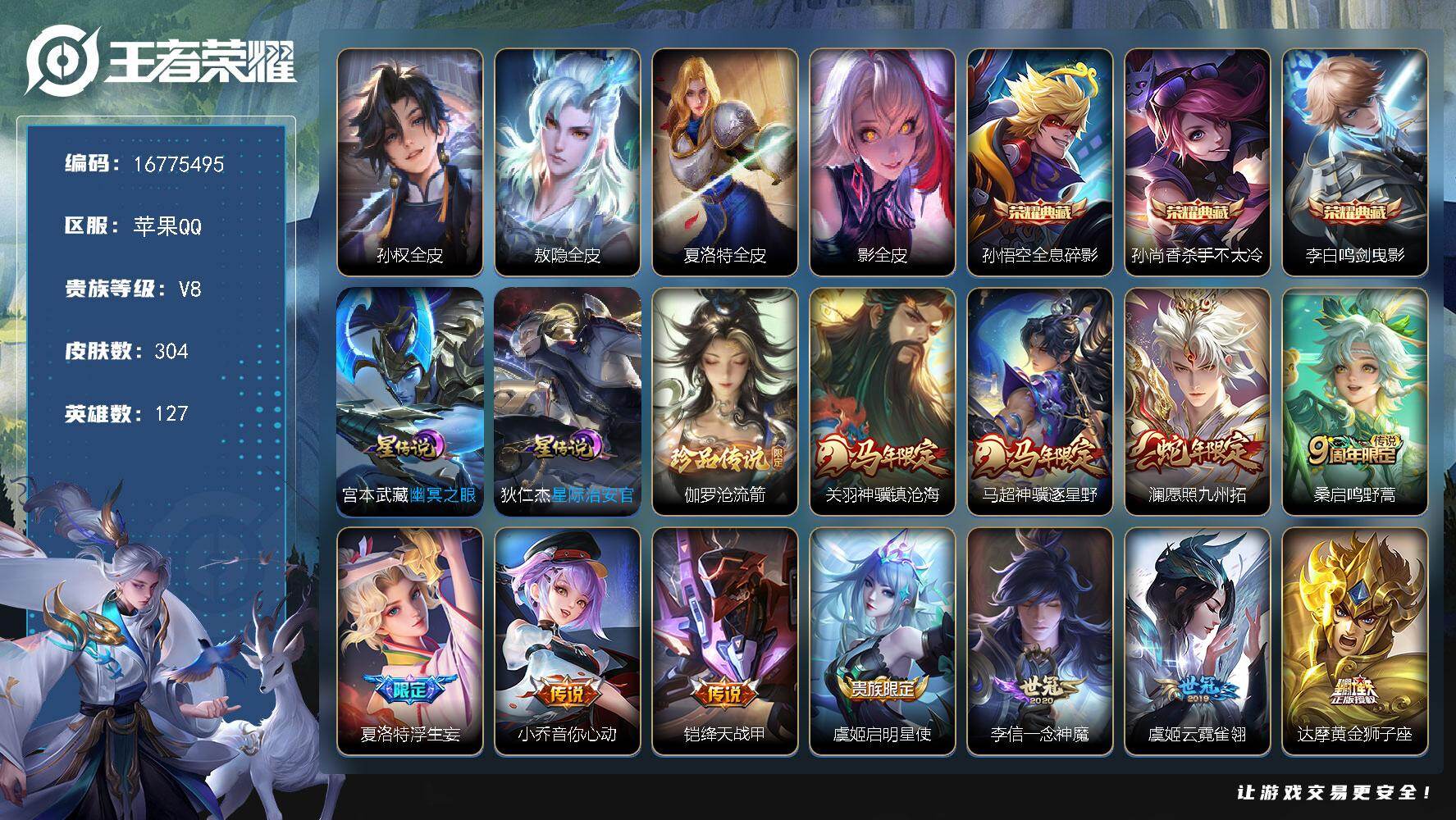 苹果Q-V8-最强王者段位-127英雄-304皮肤-3典藏皮肤-1珍品传说-15