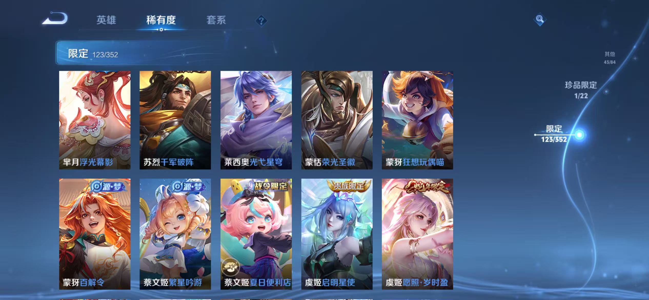 贵族8/皮肤262/典藏4/传说8/史诗75/英雄127