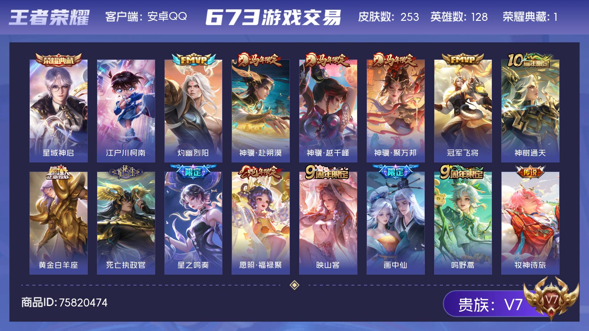 V7 皮肤253 英雄128 荣耀王者 荣耀典藏1 珍品传说1 星传说1 传说18 其他皮肤240