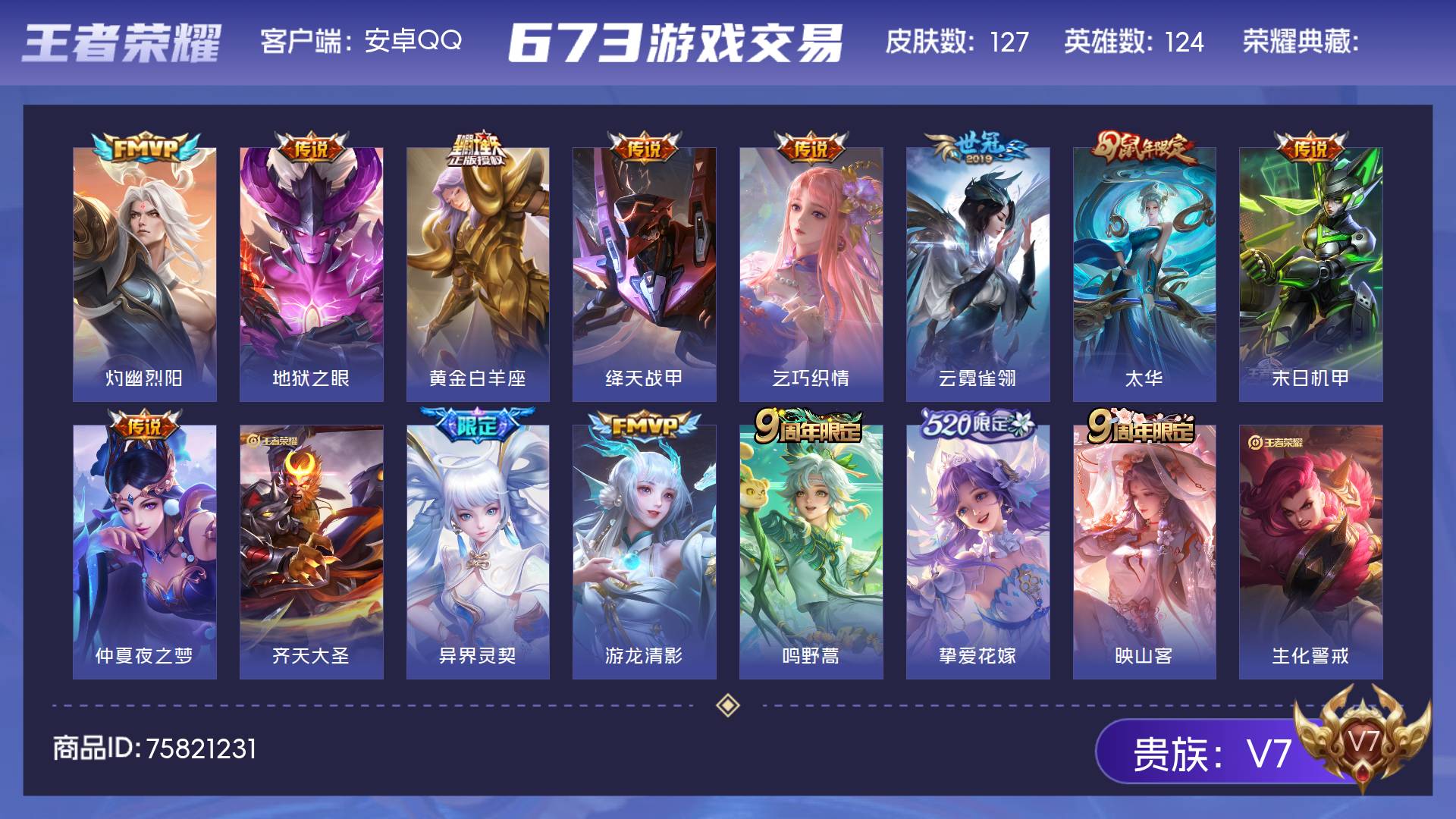 V7 皮肤127 英雄124 最强王者 星传说1 传说15 其他皮肤119