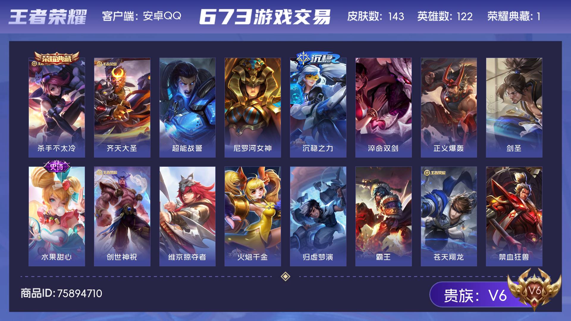 V6 皮肤143 英雄122 尊贵铂金 荣耀典藏1 传说1 其他皮肤148