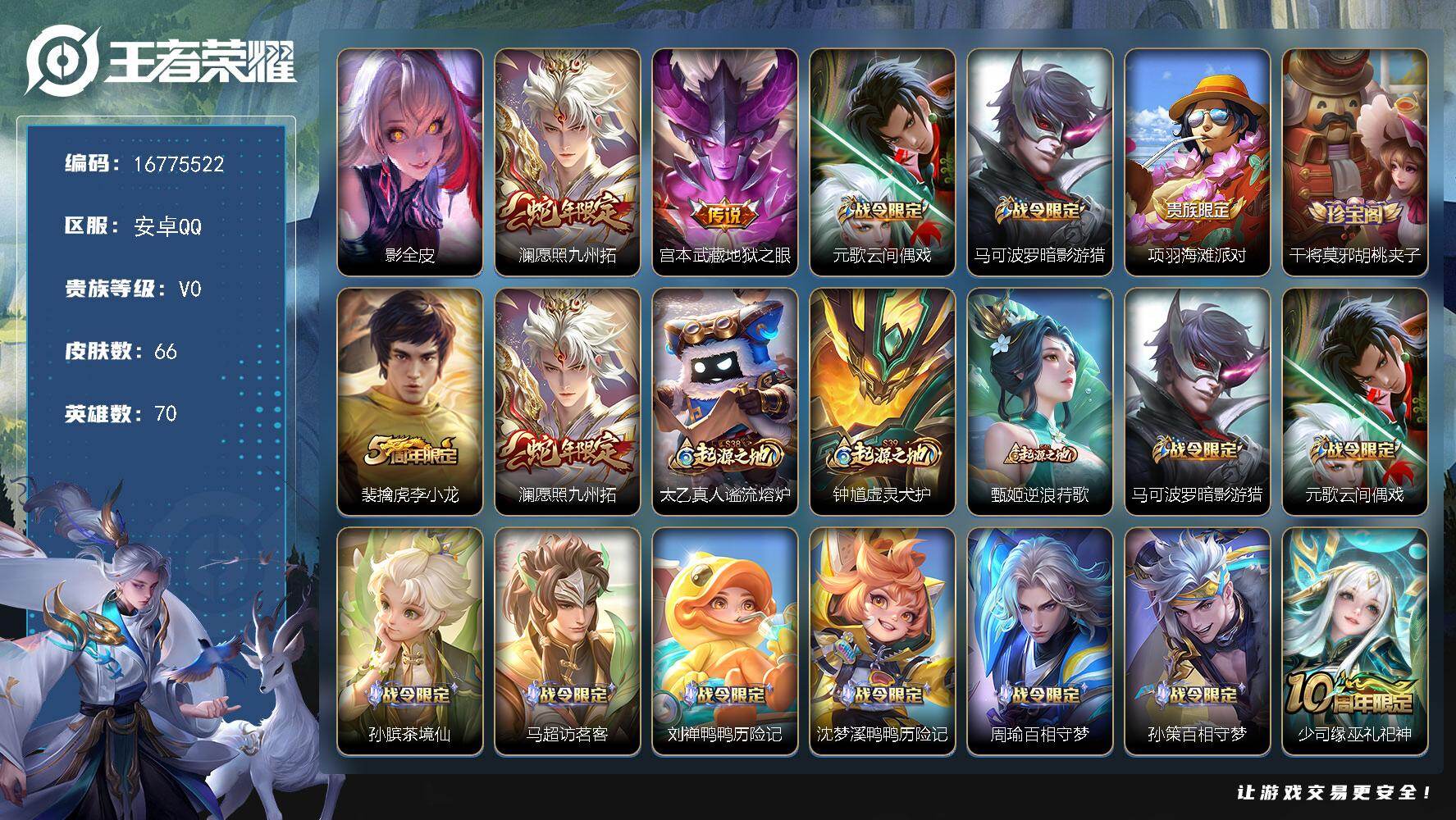 【16775522】安卓Q-V0-永恒钻石IV段位-70英雄-66皮肤-2传说