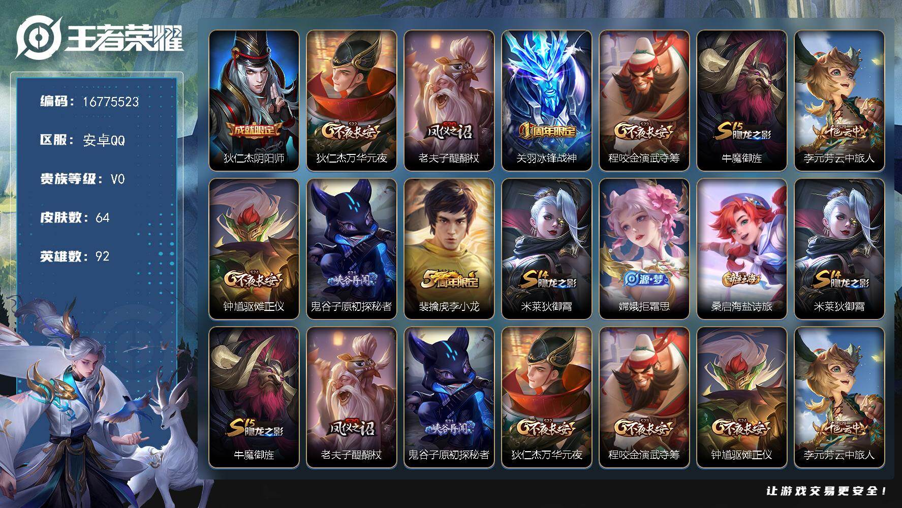 【16775523】安卓Q-V0-永恒钻石IV段位-92英雄-64皮肤-11史