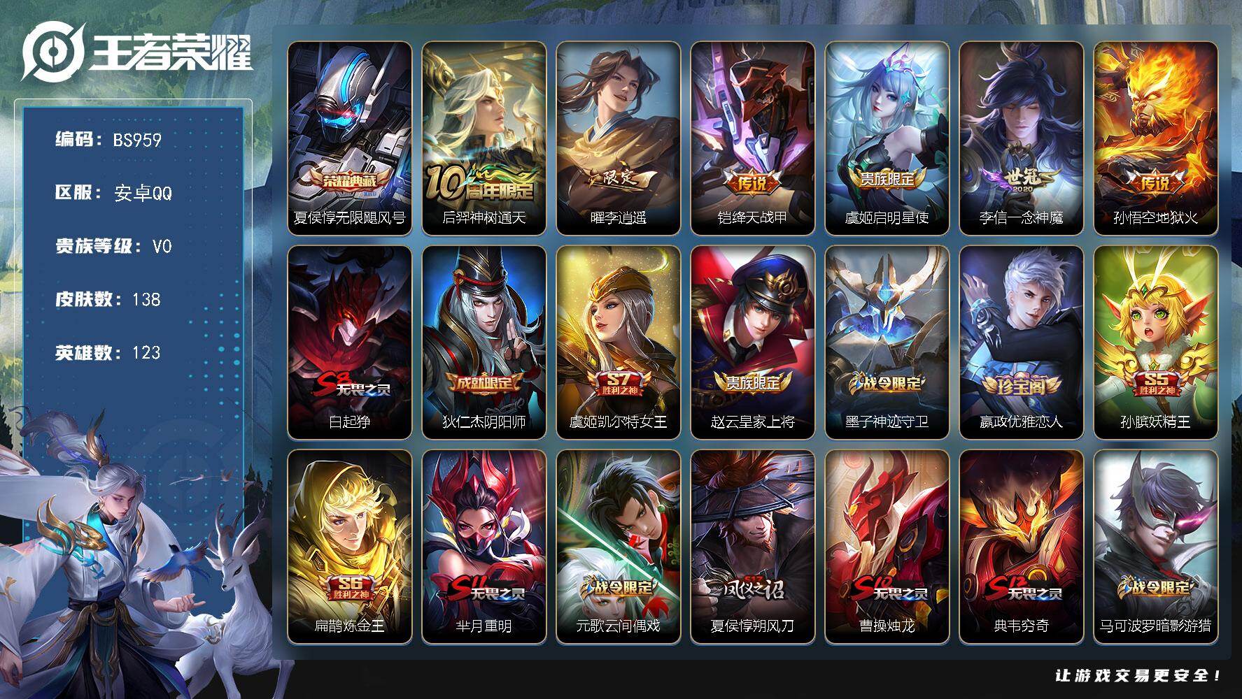 【W5902】安卓QQ-有二次-贵4-123英雄-94皮肤-4传说-25限定-